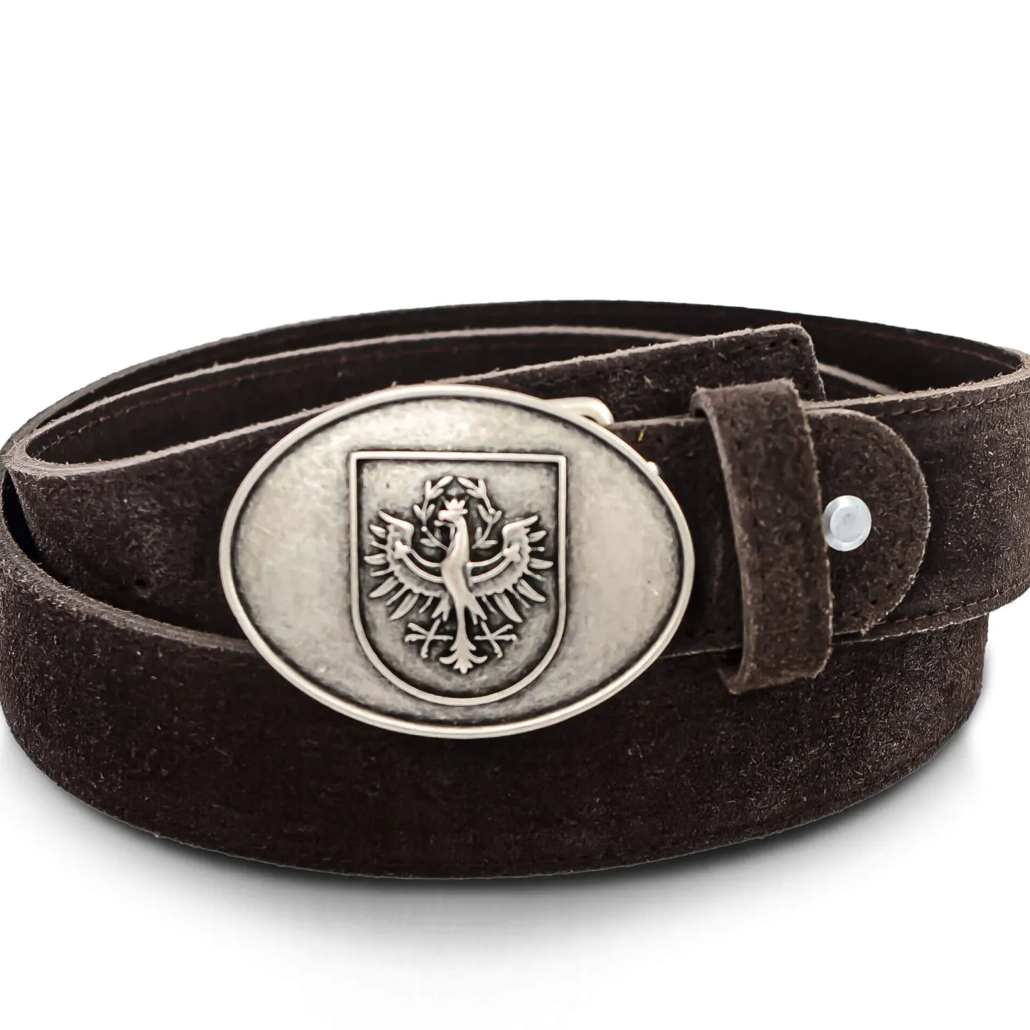 Aus hochwertigem Leder gefertigt, überzeugt der Herren Ledergürtel in Braun mit einer auffälligen Silberschnalle und dem Tiroler Adler-Wappen. Robuste Verarbeitung sorgt für Langlebigkeit.