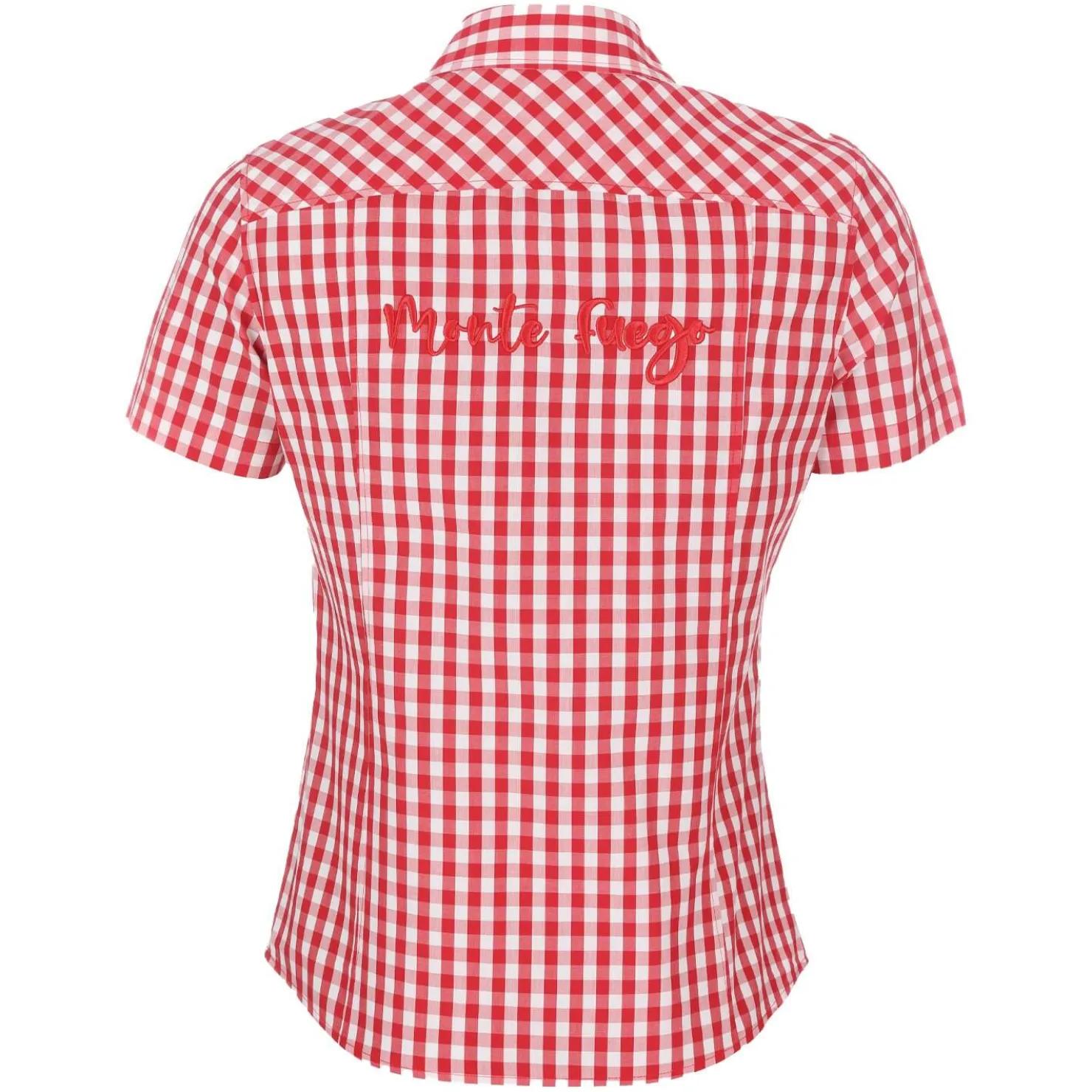 Kurzärmelige Damenbluse in Rotkariert mit Hirschhornknöpfen und besticktem Logo vorne sowie auf der Rückseite.