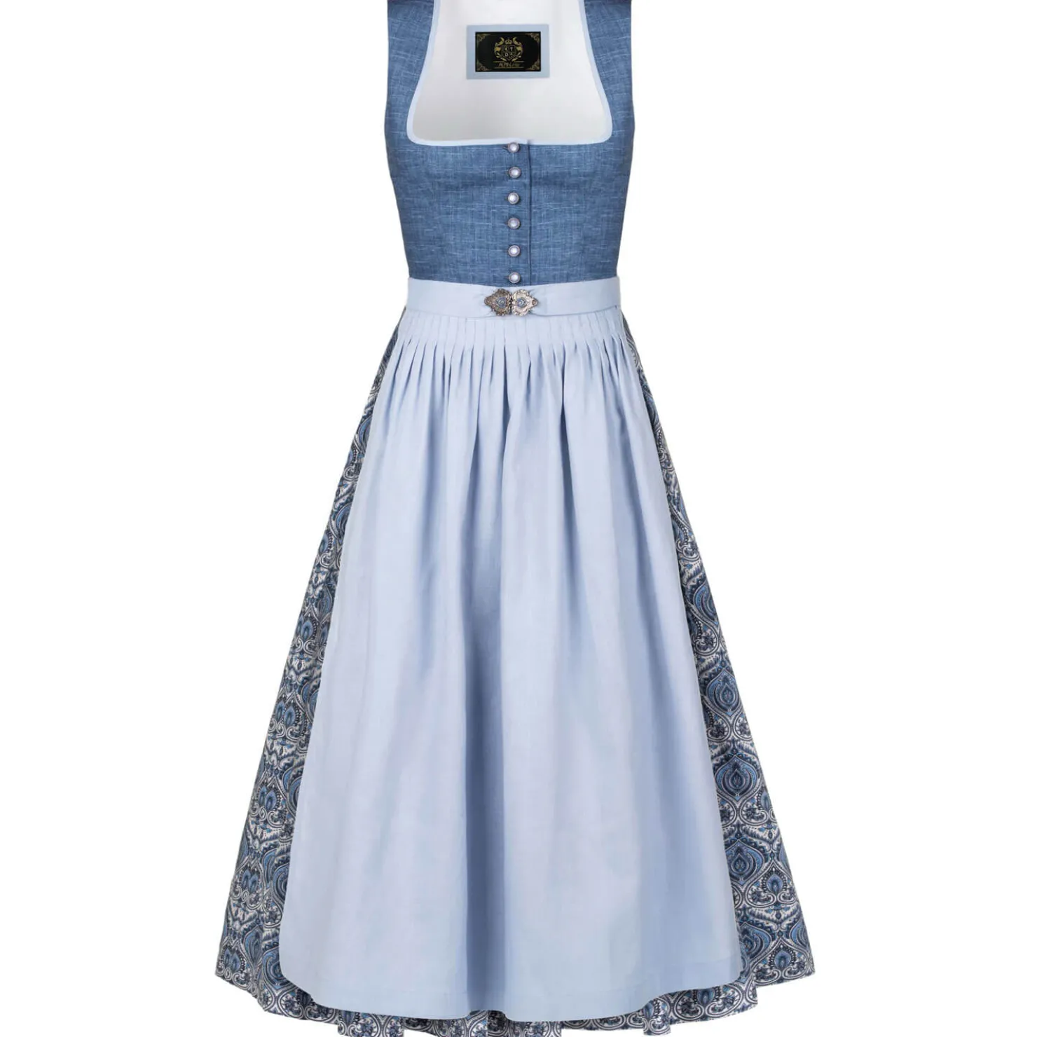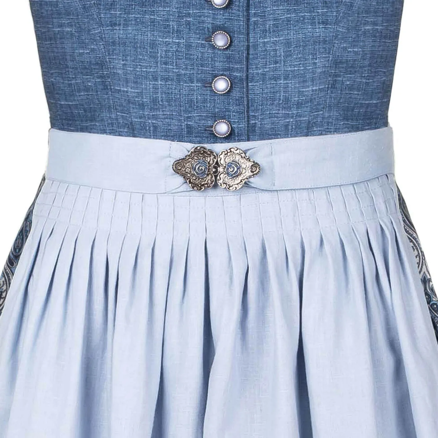 Eine filigrane Zierschließe an der Schürze rundet den Look perfekt ab und verleiht dem Outfit eine raffinierte Kombination aus Tradition und Stil.Das Dirndl besteht aus hochwertigem Material: Der Oberstoff ist 100% Baumwolle, die Schürze aus 100% Leinen, und das Futter setzt sich aus 65% Polyester und 35% Baumwolle zusammen.