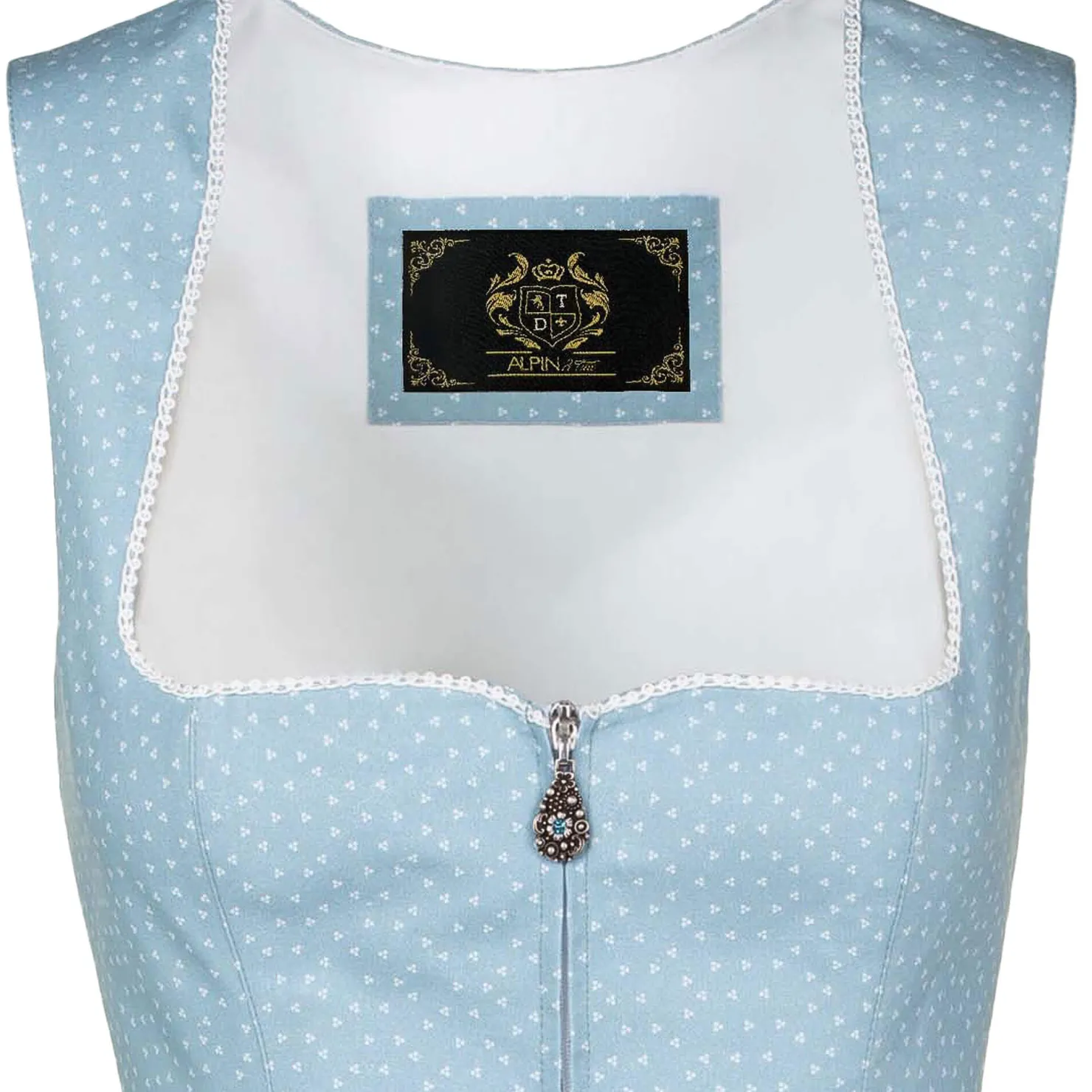Das Dirndl ist in einem sanften Hellblau gehalten und mit einem dezenten Muster aus kleinen, weißen Blümchen versehen, das dem Kleid einen charmanten und verspielten Look verleiht. Der Reißverschluss befindet sich vorne, was dem Dirndl eine moderne Note gibt und gleichzeitig das Anziehen erleichtert.Die Schürze ist aus Spitze gefertigt und mit zarten floralen Stickereien in dezenten Farbtönen verziert. Der Verschluss der Schürze ist eine Trachtenschnalle, die mit Straßsteinen verziert ist. Rund um den Ausschnitt zieht sich eine kleine, weiße Borte, die das Dekolleté sanft betont und das Gesamtbild harmonisch abrundet.