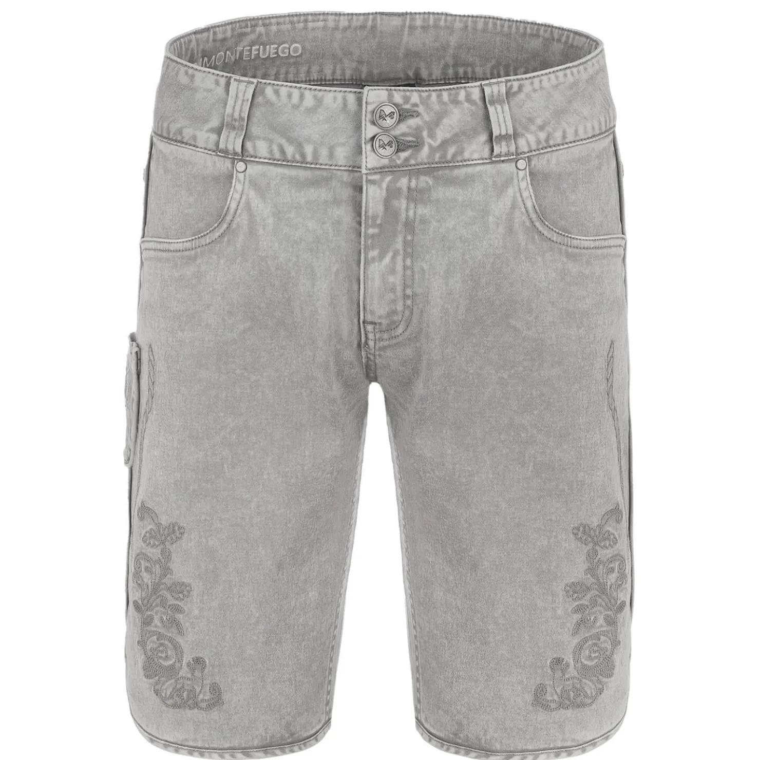 Die kurze Herren Jeans in Trachtenoptik ist in einem schönen Grauton gehalten. Der Stoff besteht aus robustem Denim aus Baumwolle und hat einen leichten Used-Look. Die Hose ist im Stil der Trachtenmode designt und hat eine schöne Stickerei vorne an beiden Beinen, auf der ein kleiner Hirsch zu sehen ist, was ihr besonderen Charme verleiht.