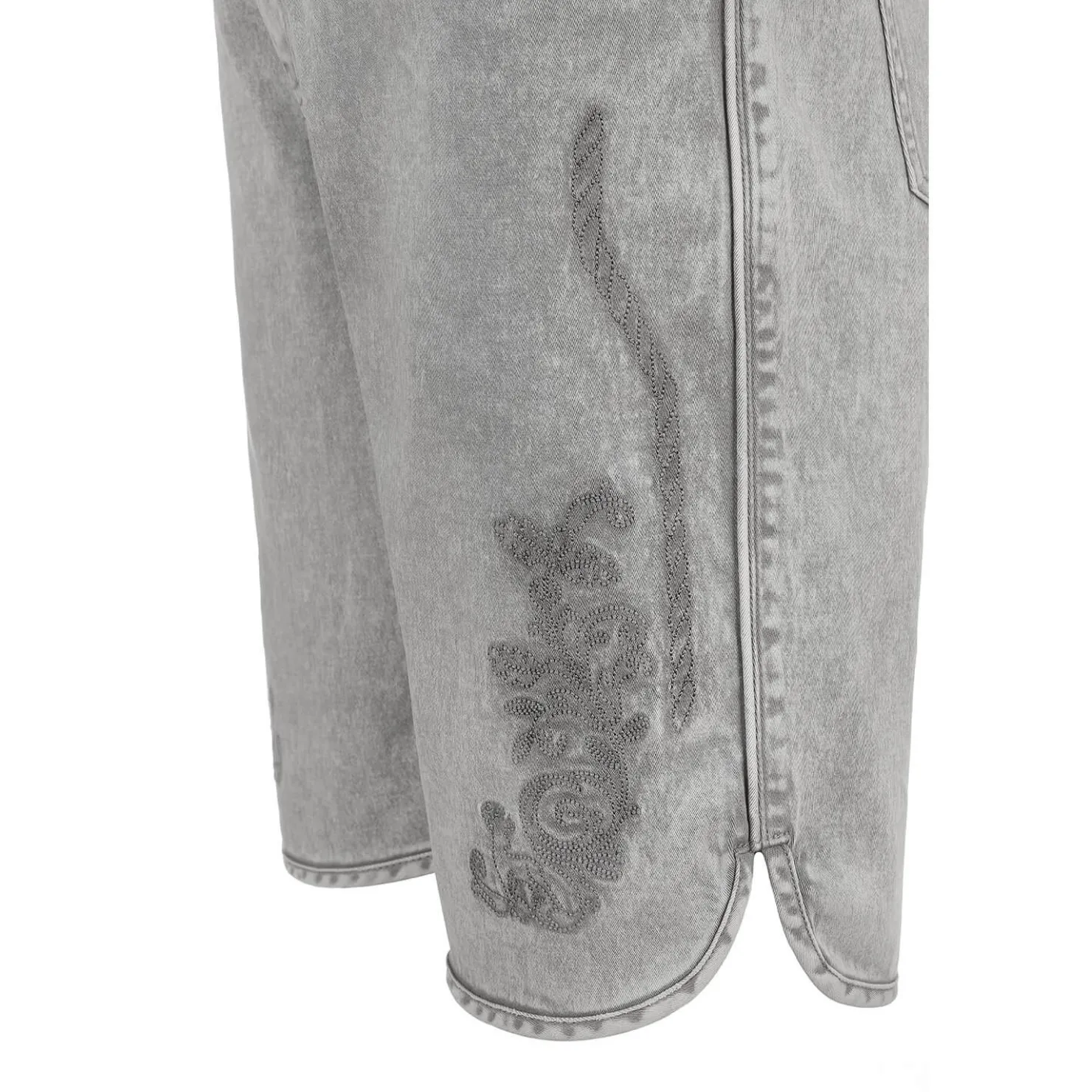 Die Hose wird mit einem Reißverschluss und zwei Knöpfen an der Vorderseite geschlossen und verfügt über Gürtelschlaufen, um noch einen besseren Sitz auf der Taille zu gewährleisten. Sie hat eine kleine Tasche an der rechten Beinseite, die ebenfalls bestickt ist, und verfügt über zwei Eingriffstaschen vorne und zwei Taschen hinten. Am Hosenbund hat sie einen Schlitz, um noch besseren Komfort zu gewährleisten.