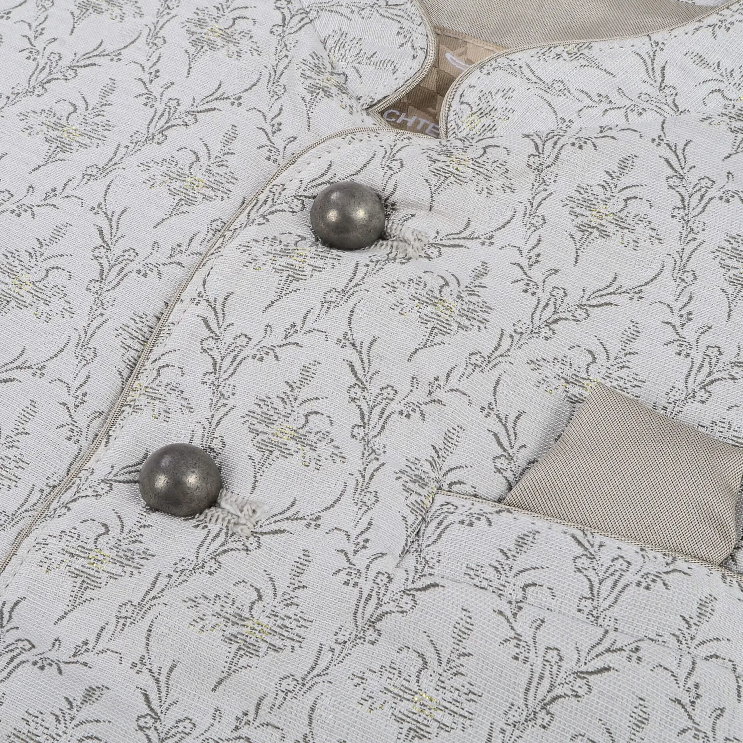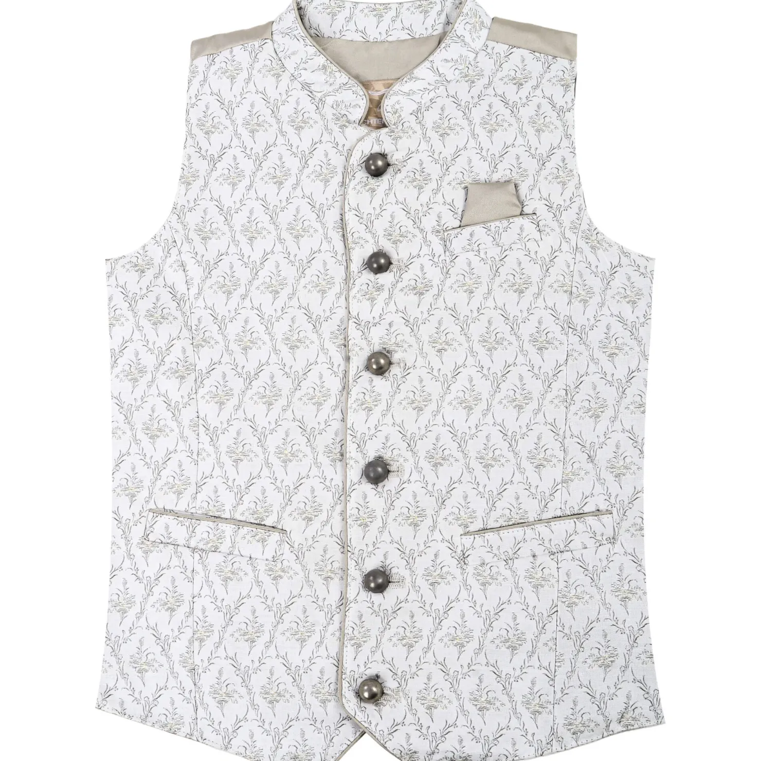 Dieses bezaubernde Kinder-Gilet in einem eleganten Creme-Ton ist aus hochwertigem Jacquard-Stoff gefertigt, der eine ansprechende Seidenoptik bietet.Die gerade Schnittführung sorgt für eine bequeme Passform, während der klassische Stehkragen dem Gilet einen stilvollen Akzent verleiht. Praktische Taschen und eine ansprechende Knopfleiste runden das Design ab und machen es zu einem idealen Kleidungsstück für besondere Anlässe oder den Alltag.Ein perfektes Accessoire, das sowohl modisch als auch funktional ist!