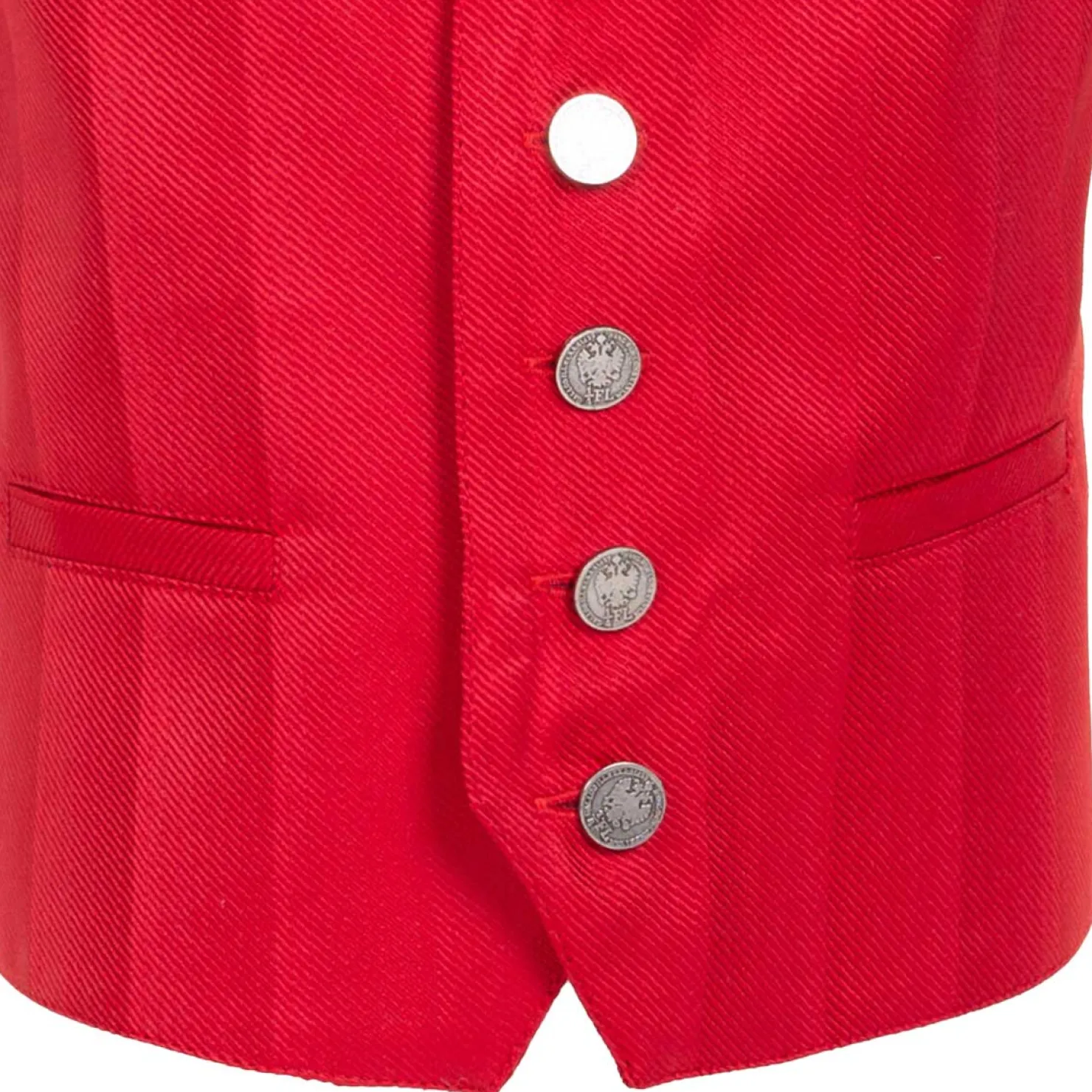 Die Vorderseite des festlichen Trachten-Gilets ist in Rot gehalten, der Rücken in klassischem Schwarz.