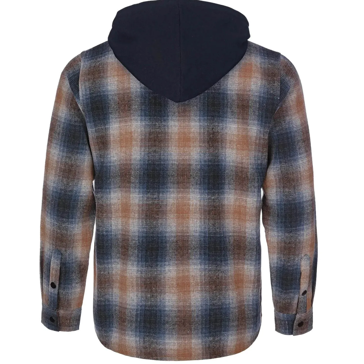 Dieses schicke Herren Flanellhemd in Blau und Orange hat ein Karomuster und eine abnehmbare Kapuze. Es ist perfekt für kalte Tage und wird mit Druckknöpfen geschlossen.