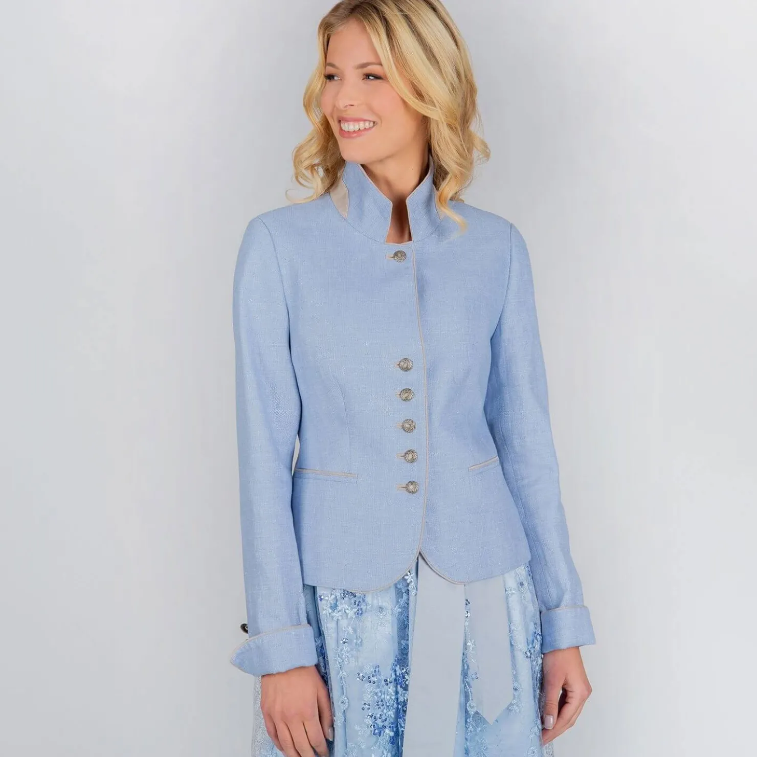 Mit liebevollen Details und eleganter Ausführung ist die Damen Trachtenjacke „Giulietta“ in Hellblau ein echter Blickfang. Sie ist verziert mit 5 Metall-Trachtenknöpfen und einem Zierknopf am Kragen, was ihren traditionellen Charme unterstreicht. Feine graue Paspeln und der Innenkragen setzen dezente Akzente und verleihen der Jacke zusätzliche Raffinesse.