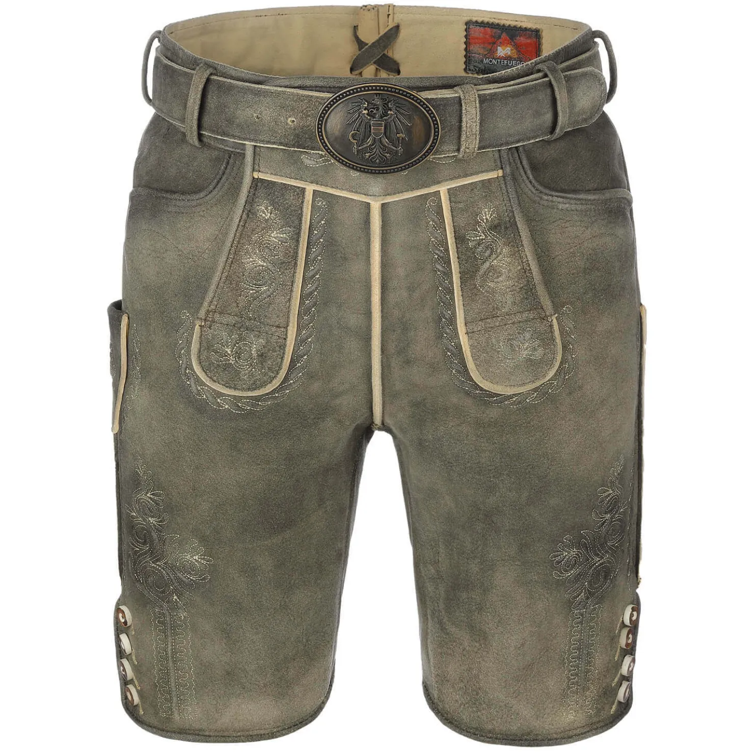 Hinten am Bund der Hose gibt es eine Schnürung, mit der man die Weite individuell anpassen kann, um einen besonders bequemen Sitz zu erreichen. Die Lederhose wird zusammen mit einem passenden Gürtel und einer Schließe mit österreichischer Adlerverzierung geliefert, die perfekt zur Optik der Hose passen.