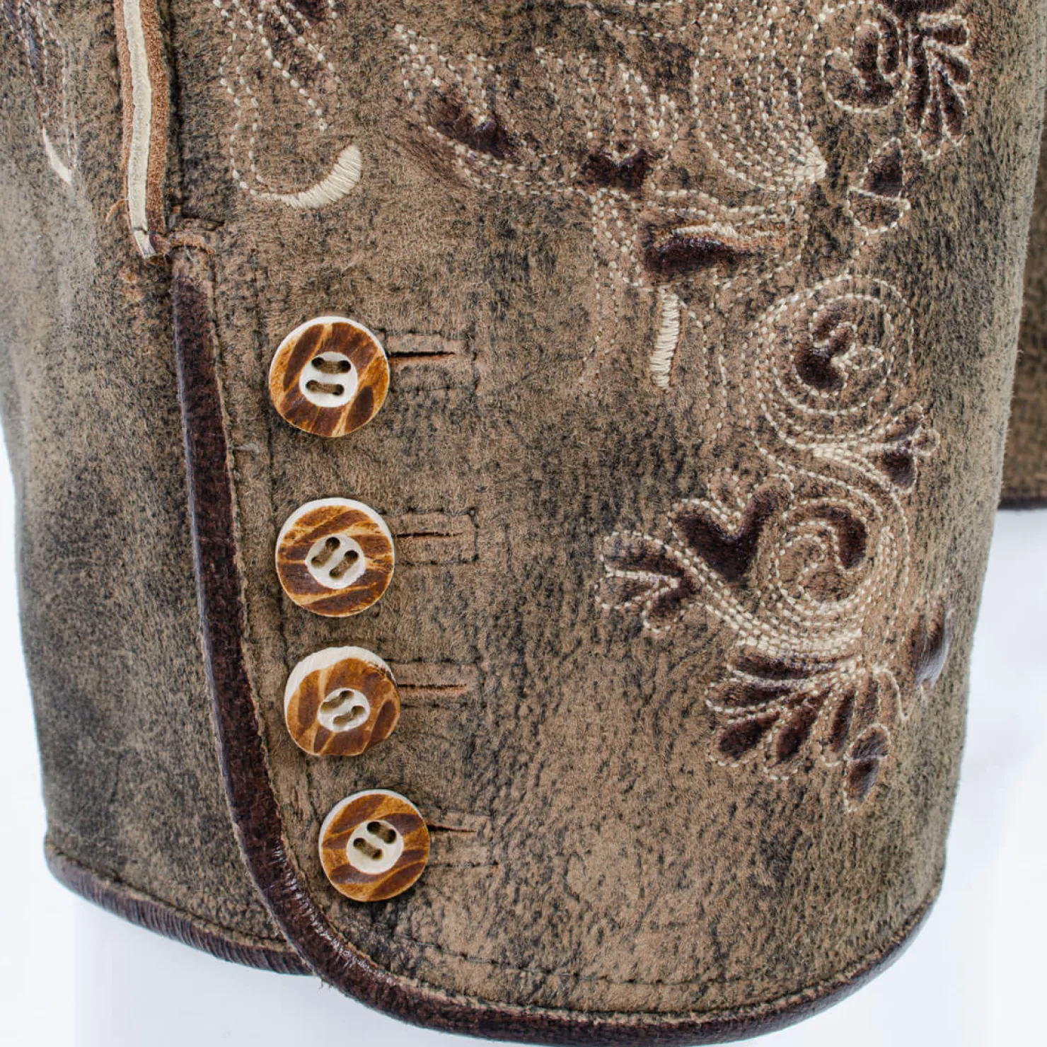 Die Herren Lederhose „Thommy“ in Hellbraun ist ein echter Hingucker, gefertigt aus butterweichem Ziegenleder. Das hochwertige Leder sorgt für höchsten Tragekomfort.Besonders hervorzuheben sind die edlen und kunstvollen Stickereien, die der Lederhose eine luxuriöse und einzigartige Note verleihen. Die Verzierungen sind sorgfältig ins Leder eingearbeitet und unterstreichen die Exklusivität der Hose.Ein weiteres Highlight ist die bronzene Gürtelschnalle, die der Lederhose einen markanten und stilvollen Akzent verleiht.