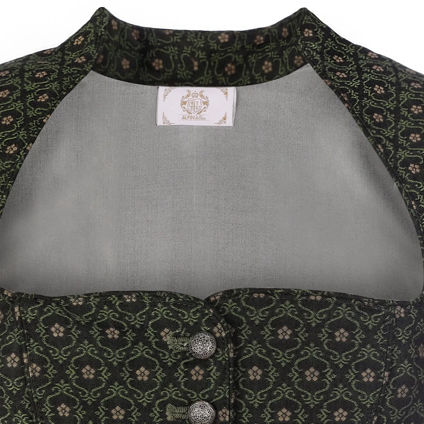 Das Dirndl-Mieder „Arina“ in Moosgrün kombiniert traditionellen Charme mit modernem Komfort. Das dehnbare Material bietet perfekte Passform und Bewegungsfreiheit. Mit edlem Muster und stilvollen Knöpfen vereint es Tradition und zeitgemäße Eleganz.