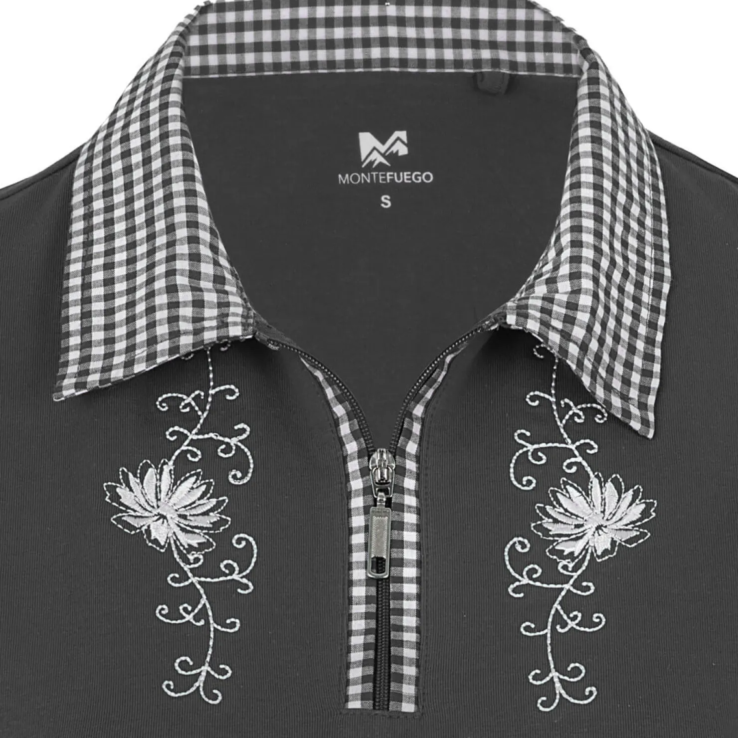 Schickes Damen Polo in der Farbe Dunkelgrau, verziert mit Blumenstickerei vorne. Der Kragen ist kariert, verfügt über einen Reißverschluss und hat karierte Akzente an den Ärmeln während die Seitenschlitze für einen angenehmen Tragekomfort sorgen.