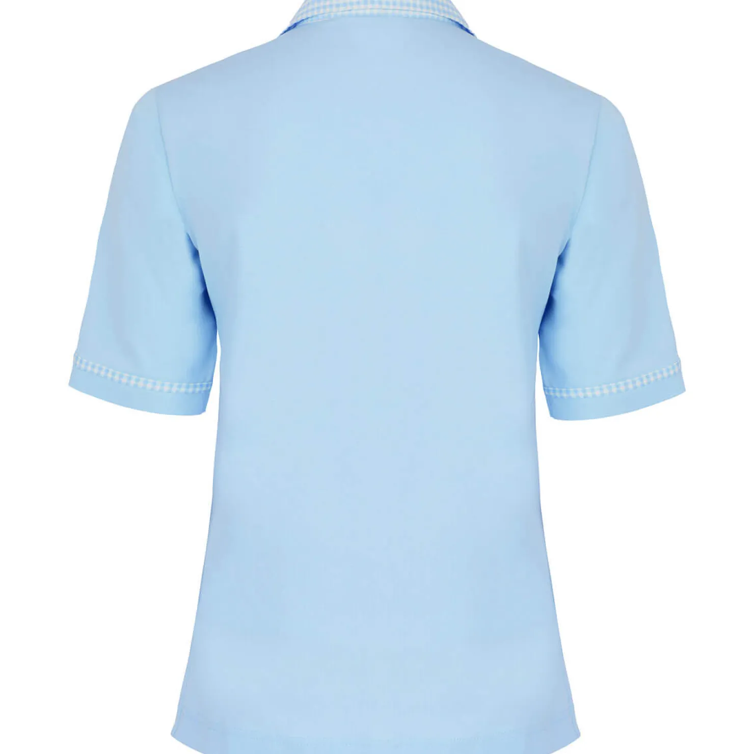 Stilvolles Damen Polo mit kariertem Kragen und einer Stickerei mit Blumen auf der Vorderseite. Die Seitenschlitze sorgen für Bewegungsfreiheit, während der karierte Armabschluss einen eleganten Akzent setzt.