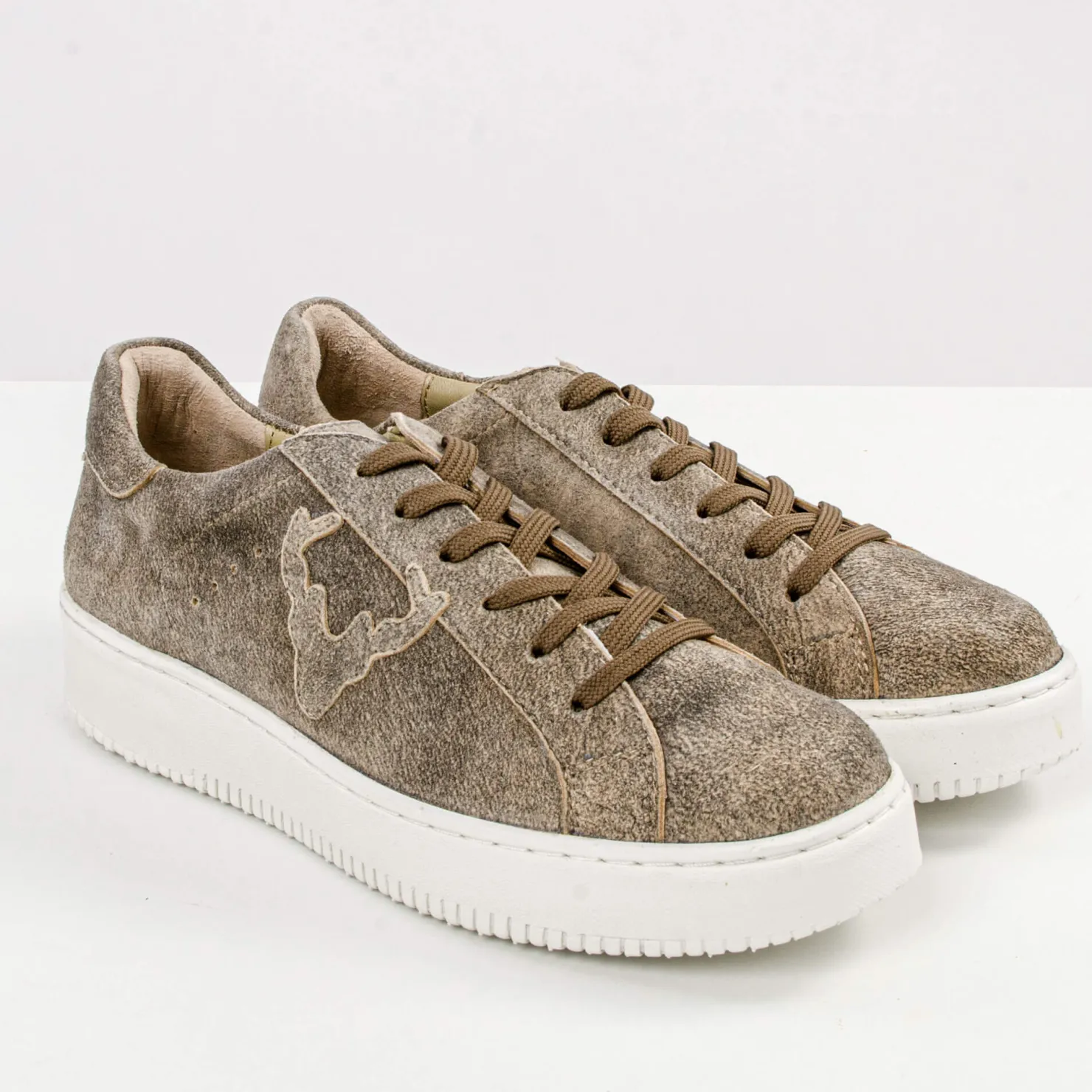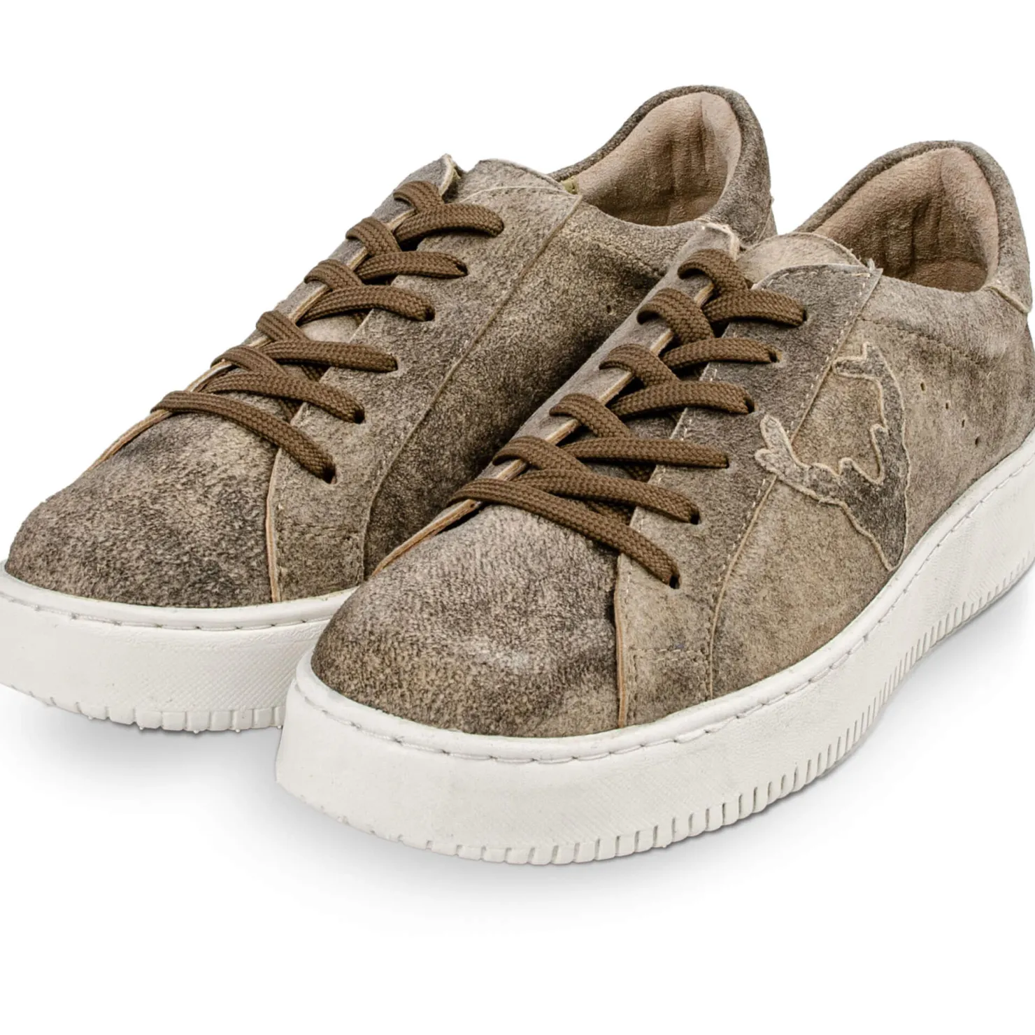 Klassische Damen Leder-Sneaker in Vintage-Tabak. Mit einem Hirschsymbol an den Außenseiten und einem verstärkten Fersenbereich und einer ca. 2 cm hohen Sohle. Der perfekte Begleiter für jeden Anlass – ob zu Jeans oder Dirndl.