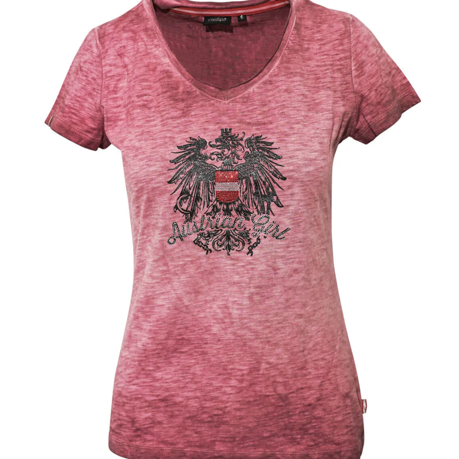Rotes Damen-T-Shirt aus weicher Baumwolle mit glitzerndem Adlerdruck und Strassstein-Schriftzug „Austrian Girl“. Österreichische Fahnen-Aufnäher und ein glitzerndes „Hoamatkultur“-Logo auf der Rückseite.