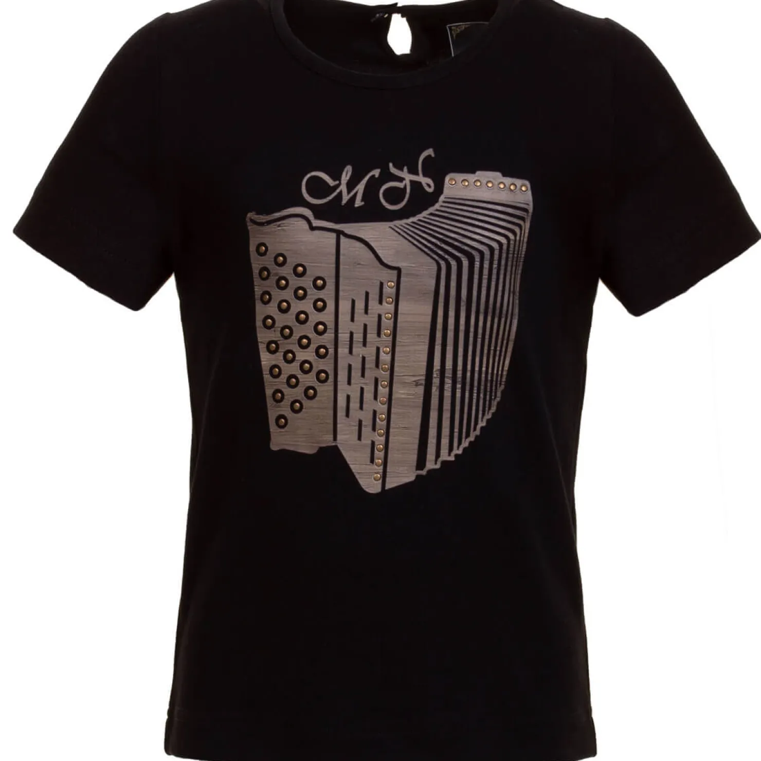 Mädchen-T-Shirt in Schwarz. Die Knöpfe in Harmonikamuster sind mit Glitzersteinen verziert.