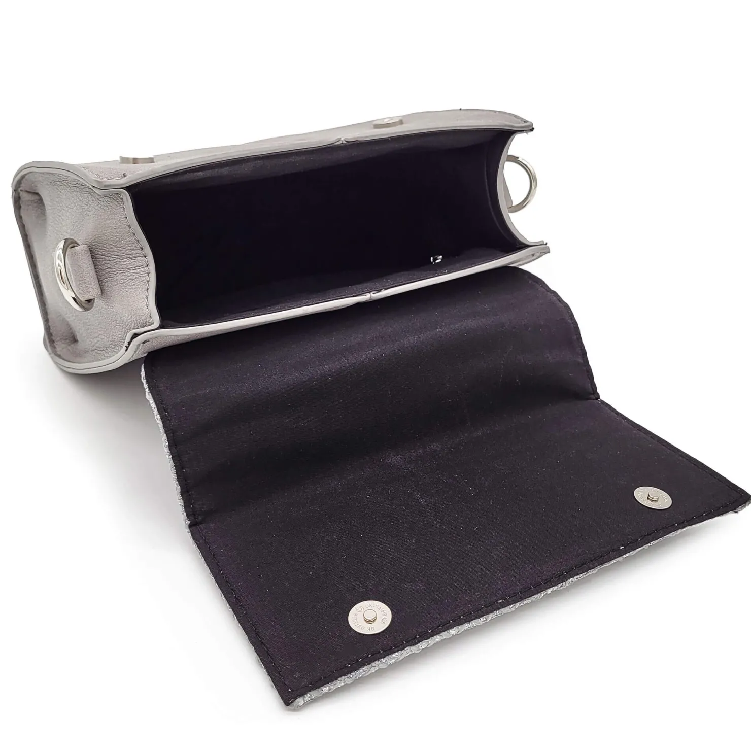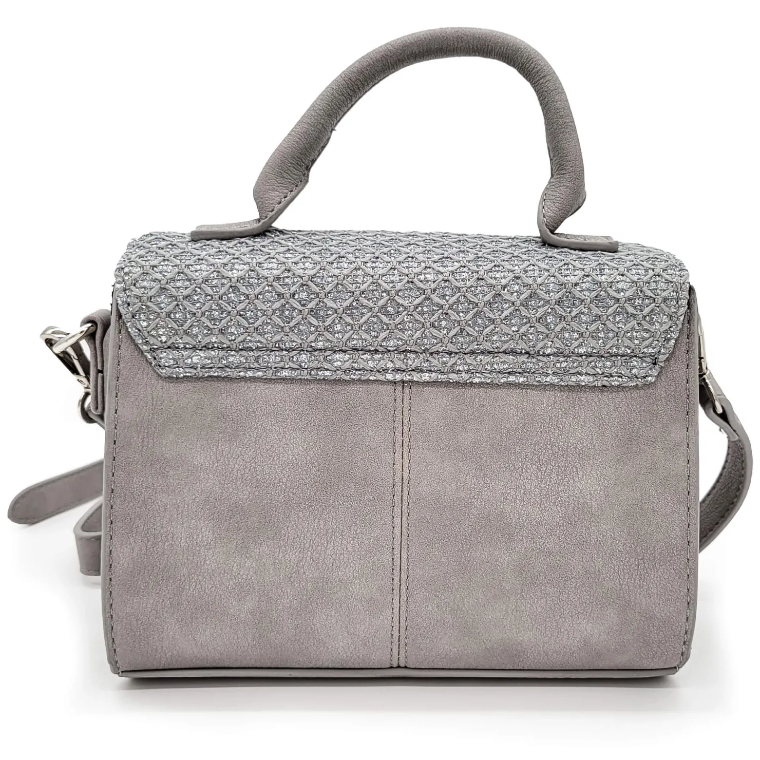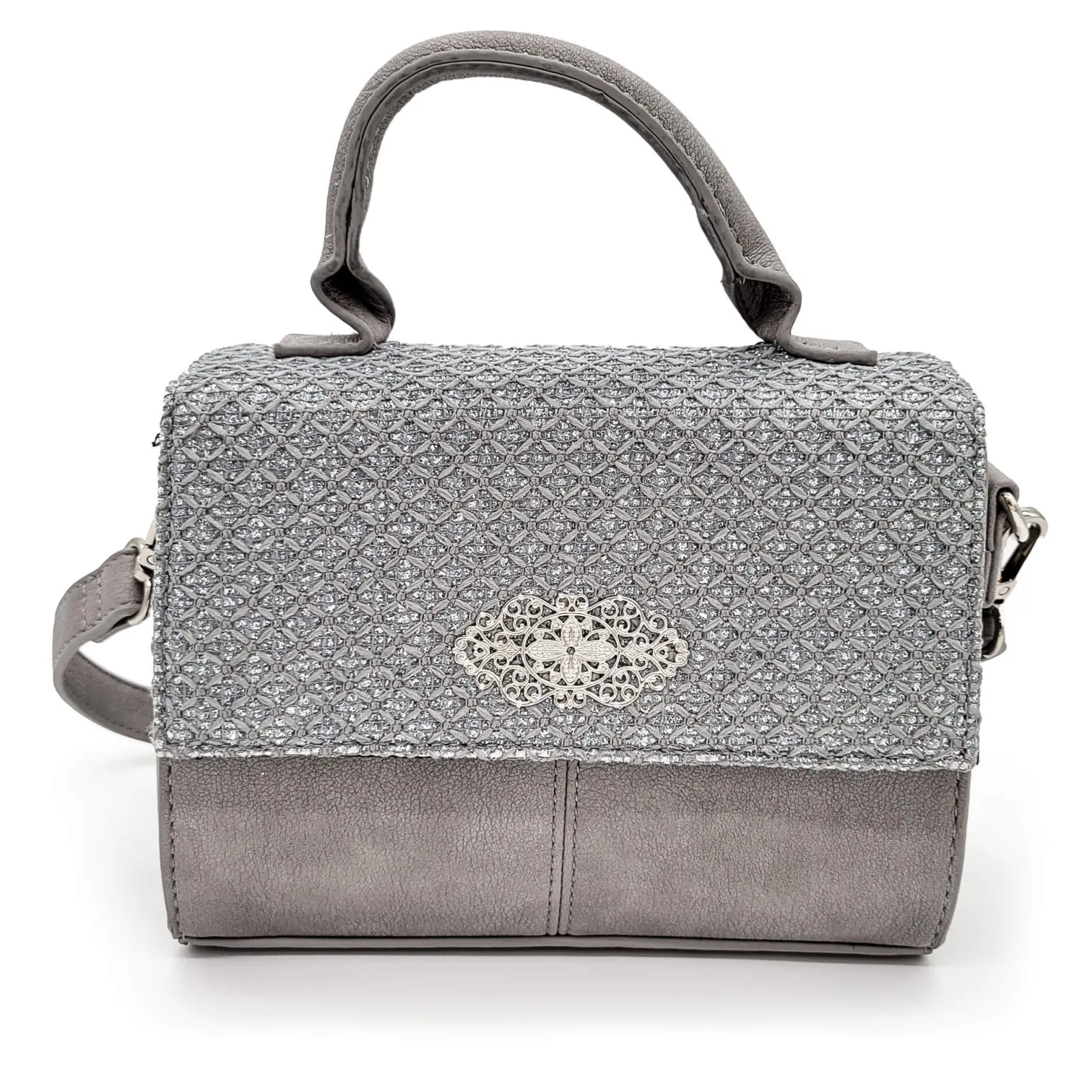 Verleihen Sie Ihrem Outfit einen Hauch von Eleganz mit dieser stilvollen Damenhandtasche in einem dezenten Hellgrau. Der Klappendeckel ist aus einem aufwendig strukturierten Material gefertigt und mit feinen silbernen Glanzfäden veredelt, die für eine edle Optik sorgen. Ein besonderer Blickfang ist die glänzende silberne Brosche, die die Vorderseite des Deckels schmückt.Die Tasche ist vielseitig tragbar: Sie verfügt über einen kurzen Henkel für ein klassisches Tragegefühl sowie einen verstellbaren Umhängegurt für mehr Flexibilität im Alltag. Funktionalität trifft hier auf zeitlose Eleganz – das perfekte Accessoire für jeden Anlass!