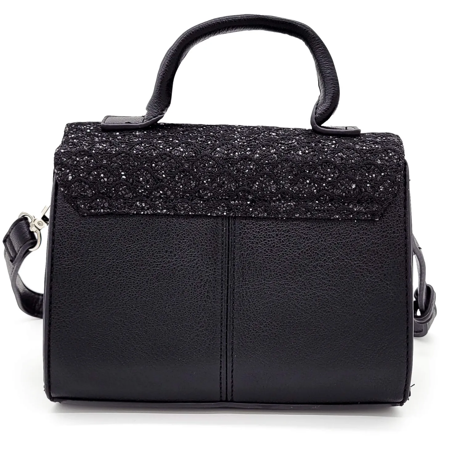 Diese elegante Damenhandtasche in elegantem Schwarz setzt stilvolle Akzente für jedes Outfit. Der Klappendeckel besticht durch ein raffiniert strukturiertes Material, das mit feinen silbernen Glanzfäden verziert ist und so für eine edle Note sorgt. Als besonderes Highlight schmückt eine glänzende silberne Brosche die Vorderseite.Die Tasche überzeugt nicht nur durch ihr Design, sondern auch durch ihre Vielseitigkeit: Mit einem kurzen Henkel für einen klassischen Look und einem verstellbaren Umhängegurt bietet sie Flexibilität für jeden Anlass. Ein Accessoire, das Funktionalität mit zeitloser Eleganz verbindet!