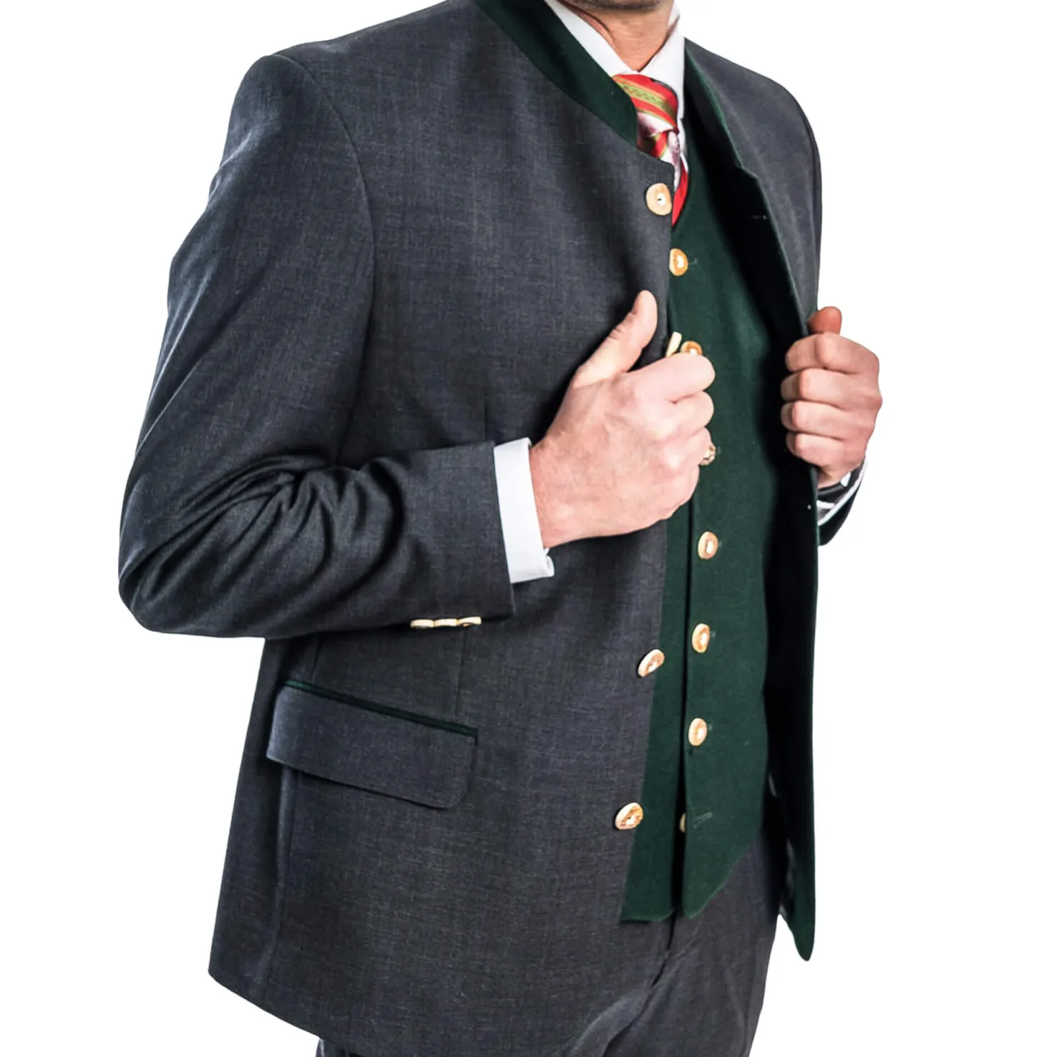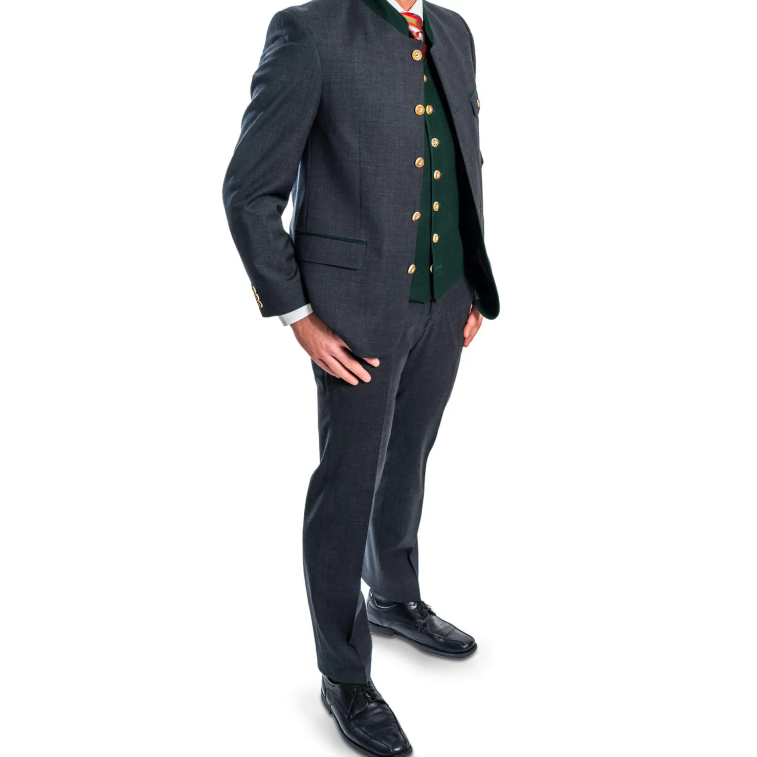 Dieser Trachtenanzug besteht aus einem eleganten Sakko in Stehbrustoptik und einer passenden Bügelfaltenhose.Er ist in den Größen 46 bis 60 erhältlich und aus 45% Wolle und 55% Polyester gefertigt. Der niedrige Stehkragen des Sakkos und die Knöpfe mit Adler-Motiv verleihen dem Anzug einen traditionellen Look.Das Sakko ist schwarz mit einem dunkelgrünen Innenfutter und Kragen. Es hat zwei Außentaschen, eine Brusttasche und zwei Innentaschen.Die Hose hat zwei Vordertaschen und eine Gesäßtasche. Der Anzug kombiniert klassischen Stil mit hohem Tragekomfort und ist ideal für festliche Anlässe.