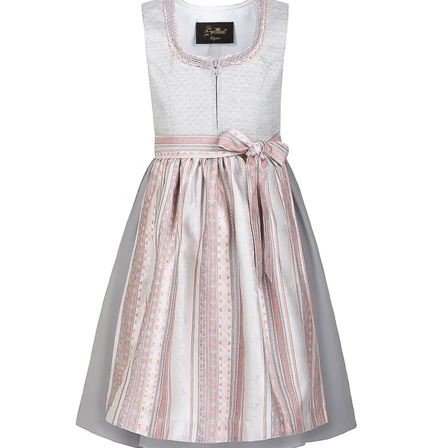 Das Dirndl „Frida“ besticht mit seinem eleganten Jaquard-Mieder, das mit feinen Borten verziert ist und eine zeitlose Eleganz ausstrahlt. Ab Größe 122/128 wird der Reißverschluss mit einem dekorativen Anhänger verziert, der dem Dirndl eine zusätzliche raffinierte Note verleiht.