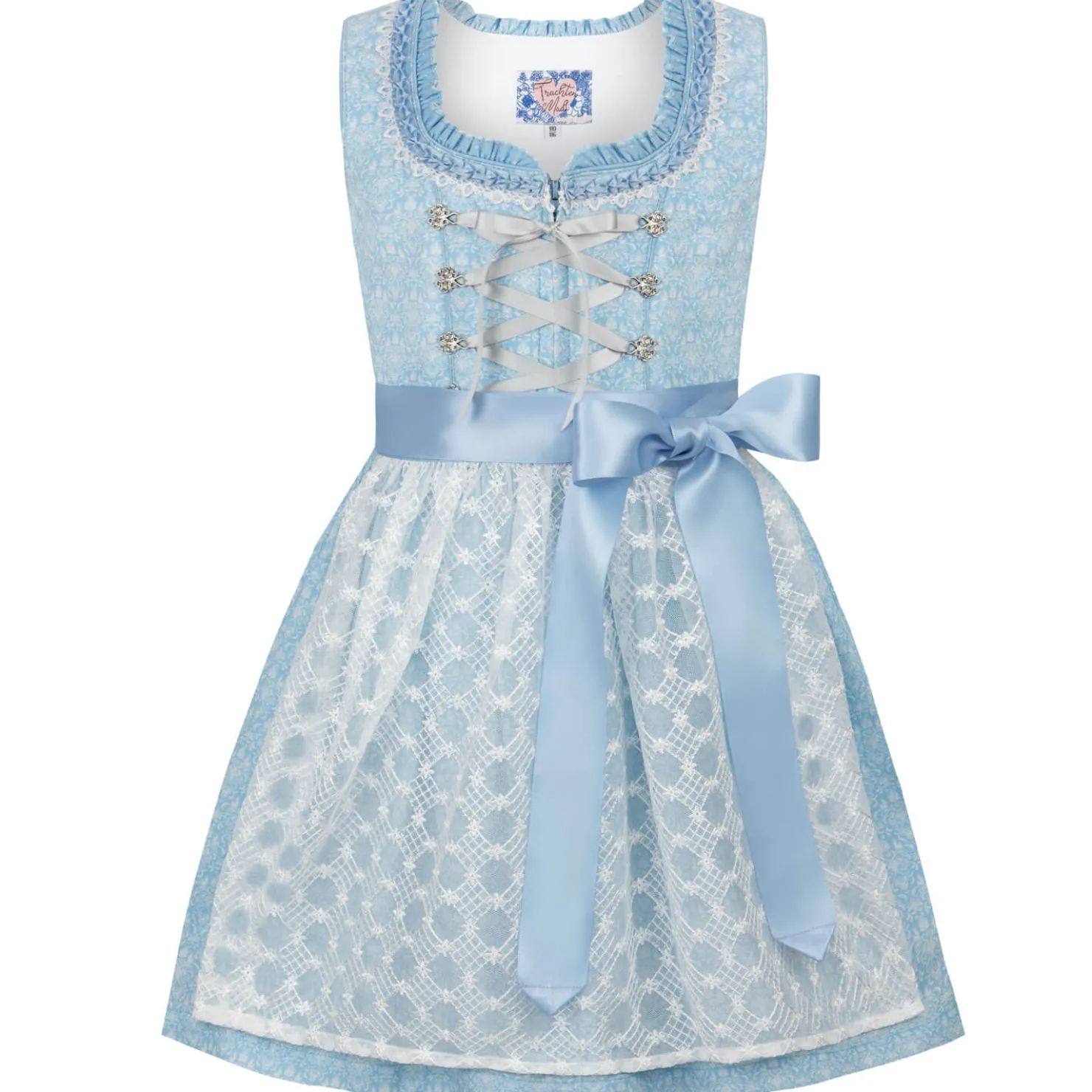 Das edle Dirndl aus pflegeleichter Baumwolle verzaubert durch das florale gedruckte Allover Muster und ist mit liebevollen Details versehen. Für den trendigen Trachten Look sorgen die eingearbeiteten Rüschen am Halsausschnitt, die aufgenähten Zierborten sowie die verzierten Miederhaken.Die Schnürung mit farbigem Satinband unterstreicht dieses stilvolle Design. Durch die filigrane, farblich abgestimmte Spitzenschürze entsteht der besondere Look.