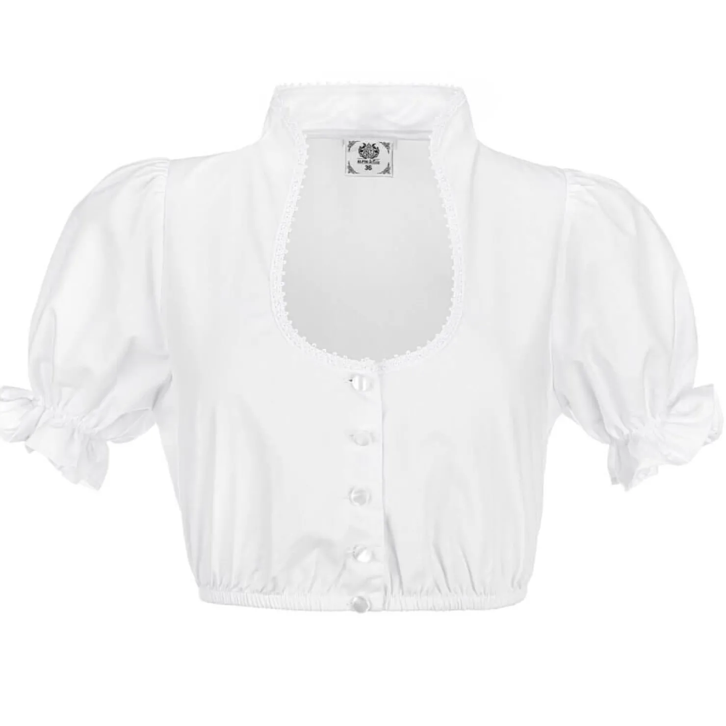 Die Dirndlbluse „Lisal“ in Weiß vereint Eleganz und Charme. Mit ihrem Stehkragen-Ausschnitt bringt sie einen Hauch von Raffinesse in Ihr Outfit. Die Kurzarmbluse besteht aus Polyester und Baumwolle und bietet eine angenehme Passform. Dekorative Knöpfe und puffige Tüllärmel verleihen der Bluse eine zauberhafte Ausstrahlung.