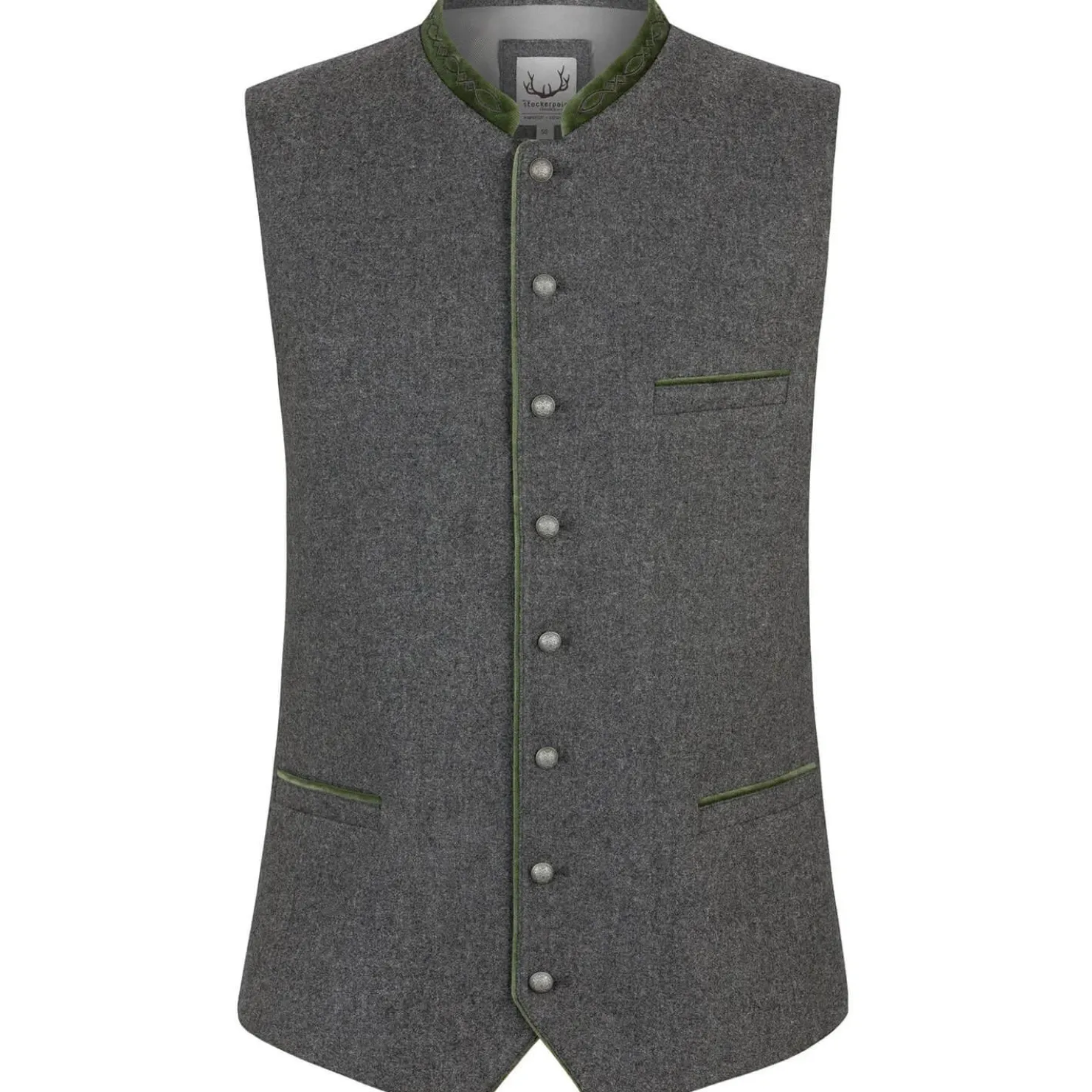 Gilet aus hochwertigem, melierten Lodenstoff mit Stehkragen aus feinem, grünen Baumwollsamt.Die gerade Schnittführung der Weste sorgt nicht nur für eine hervorragende Passform, sondern auch für einen angenehmen Tragekomfort.Der Rücken der Weste ist in schwarz, dezent gestreiften Satinstoff gehalten. Trachtige Kugelknöpfe aus Altsilber runden das Design ab.