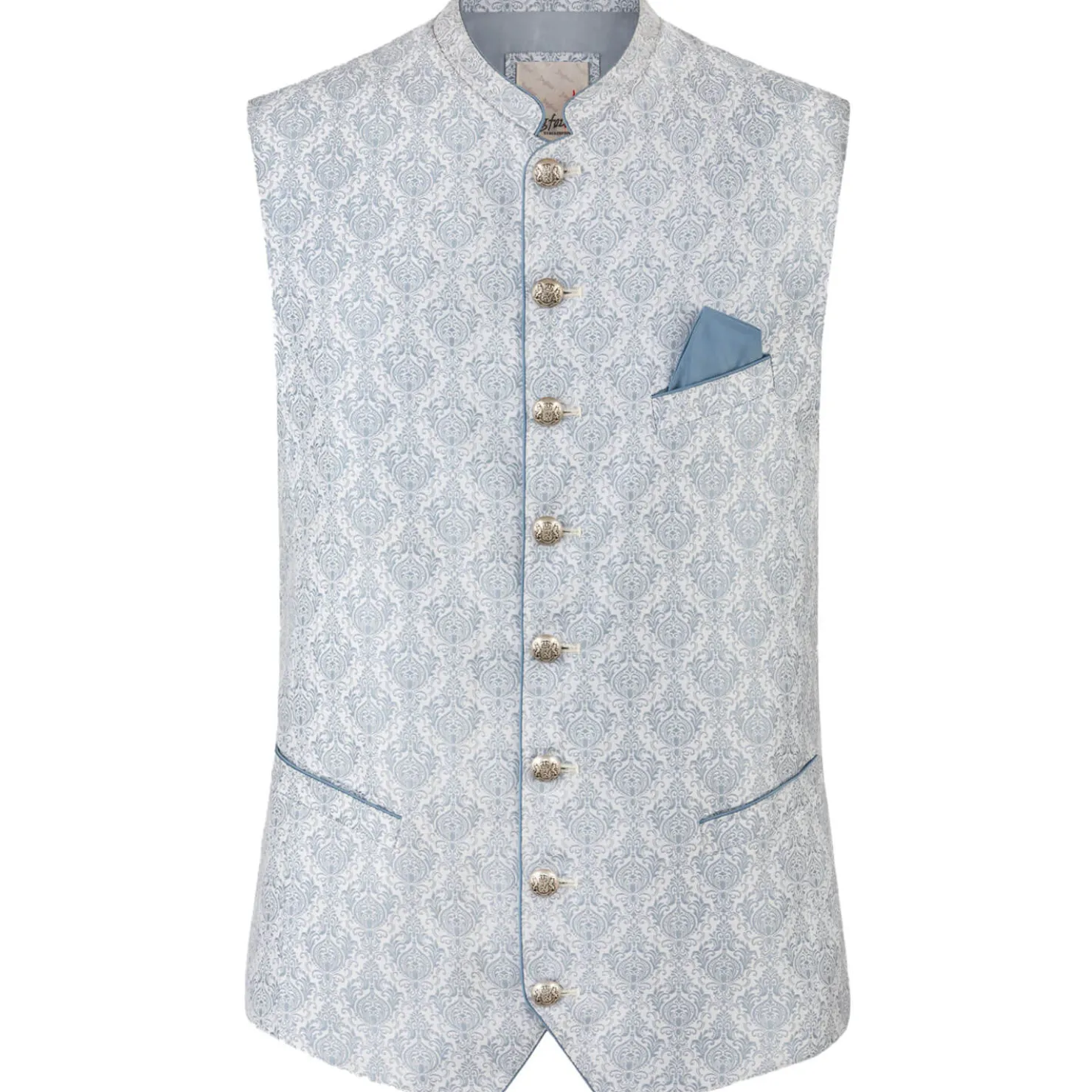 Die hochwertige Weste ist aus einem hochwertigen Jacquard Stoff in Seidenoptik gefertigt.Die gerade Schnittführung garantiert eine sehr gute Passform und einen angenehmen Tragekomfort. Der klassische Stehkragen, die Taschen und die Knopfleiste sind mit einem farblich abgestimmten Paspel gefertigt und unterstreichen das exklusive Design.Trachtige Knöpfe in altsilber setzen sich gekonnt in Szene.