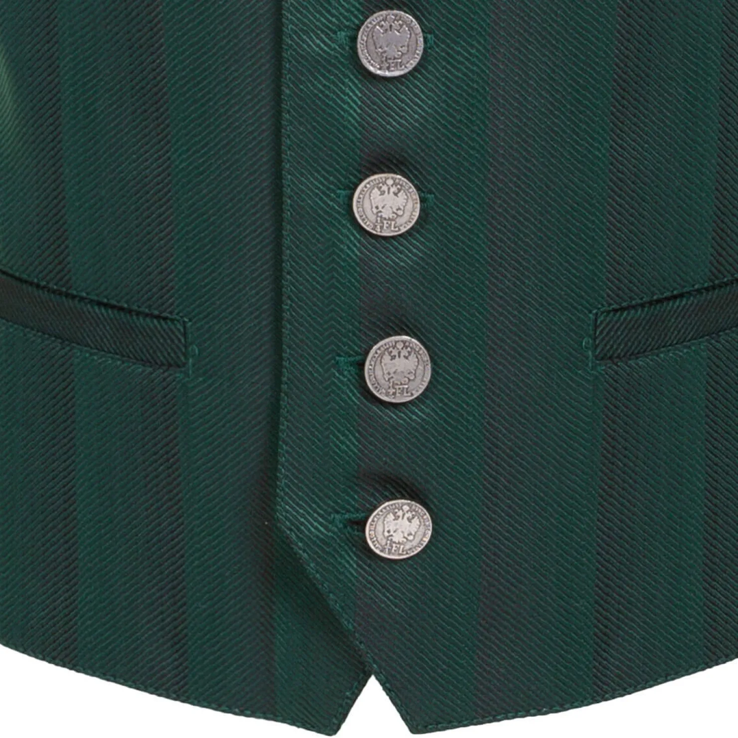 Die Vorderseite des festlichen Trachten-Gilets ist in Dunkelgrün gehalten, der Rücken in klassischem Schwarz.