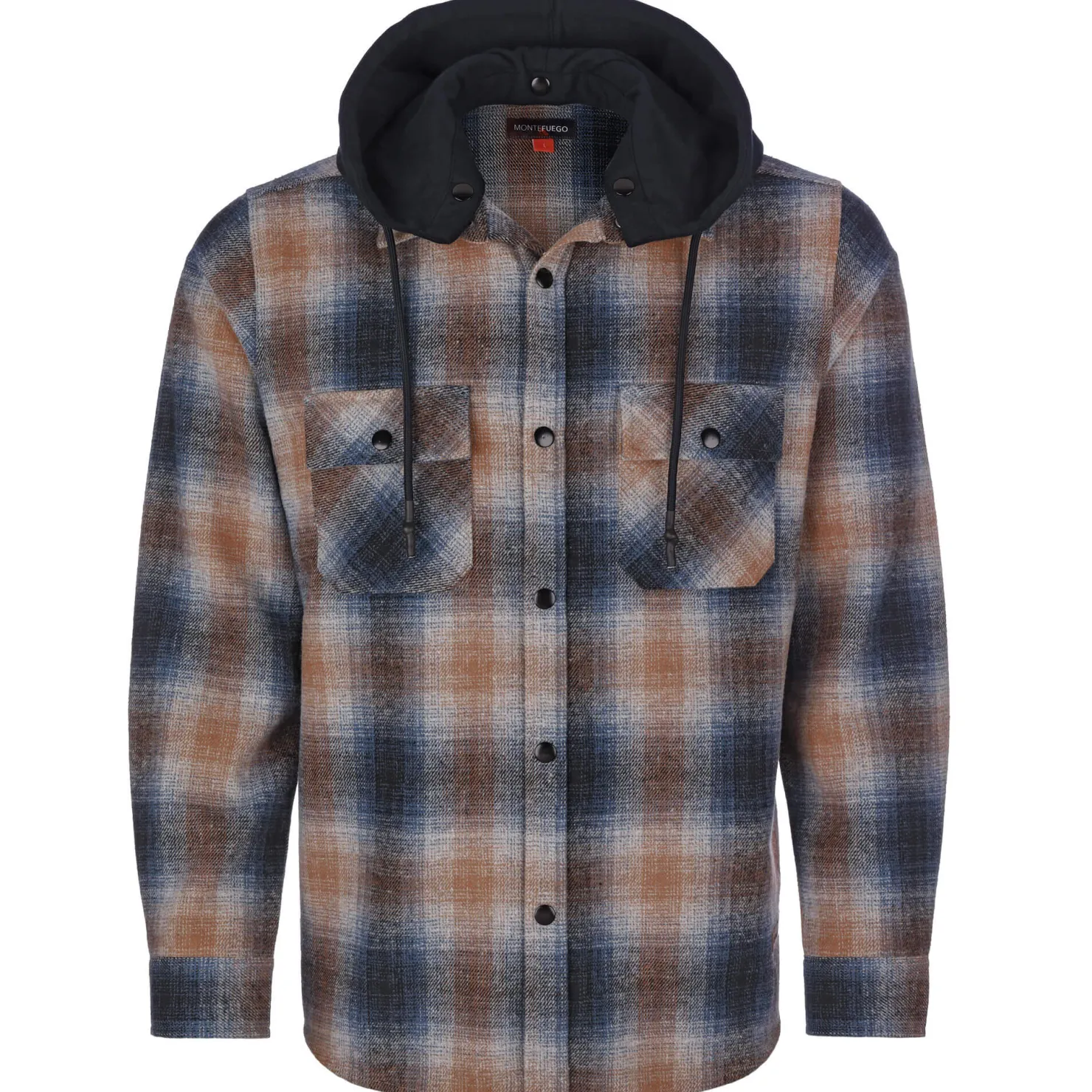 Dieses schicke Herren Flanellhemd in Blau und Orange hat ein Karomuster und eine abnehmbare Kapuze. Es ist perfekt für kalte Tage und wird mit Druckknöpfen geschlossen.