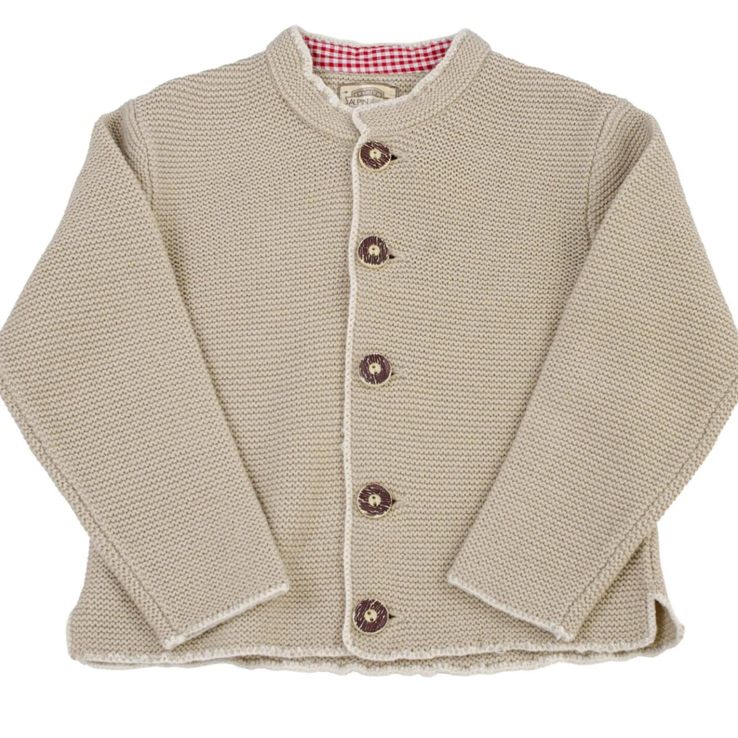 Klassische Kinder-Strickjacke, die sowohl für Jungen als auch Mädchen geeignet ist. Die Jacke ist in einem eleganten Beige gehalten und mit Knöpfen in Hirschhornoptik versehen.Die Strickjacke besteht aus einer Mischung aus 50% Acryl und 50% Wolle, was für eine angenehme Wärme und Tragekomfort sorgt.Der niedrige Stehkragen verleiht der Jacke eine schlichte Eleganz. Die Knopfverschlüsse in Hirschhornoptik setzen traditionelle Akzente. Das Muster präsentiert sich in unifarbenem Beige mit einem karierten Innenkragen. Ein weißer Häkel-Rand entlang des Abschlusses und der Verschlüsse verleiht der Strickjacke einen charmanten, verspielten Touch.Diese vielseitige Kinder-Strickjacke passt sowohl zur Lederhose als auch zum Dirndl.