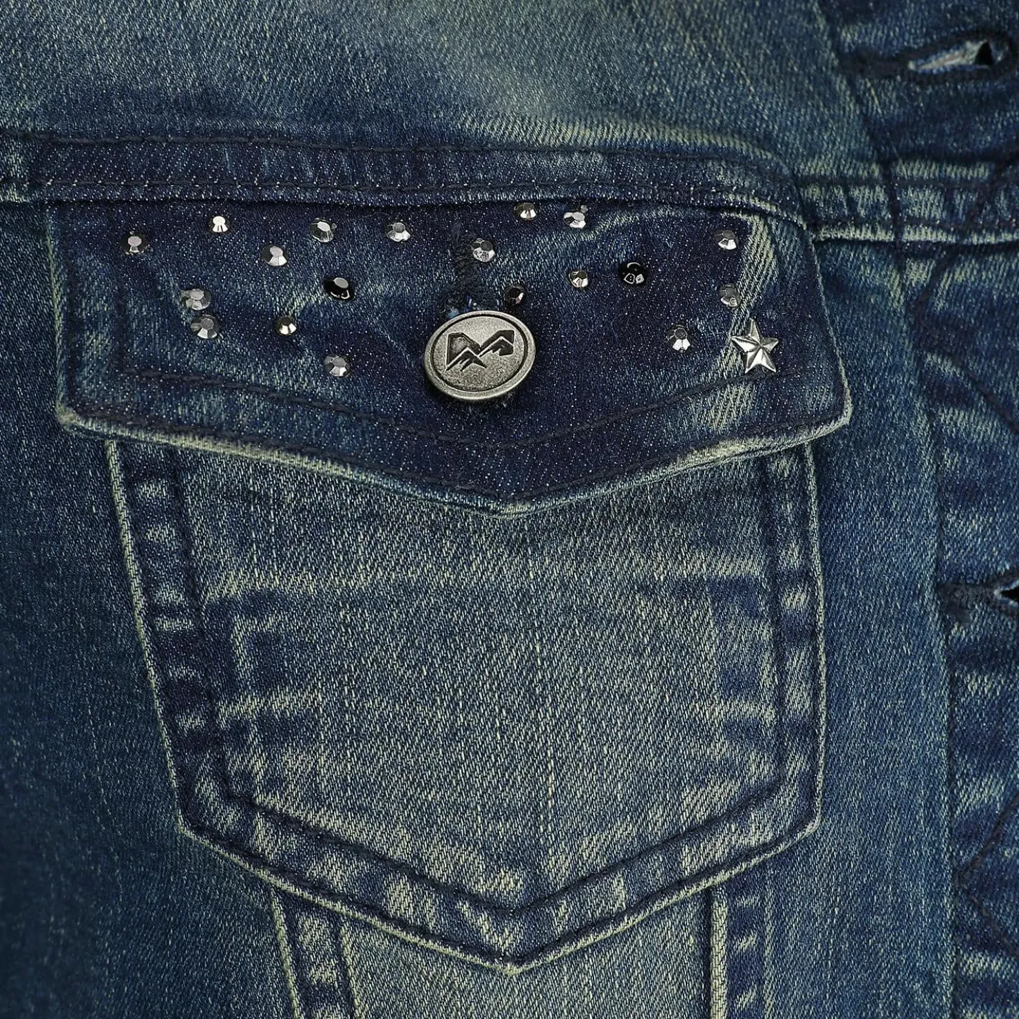 Hochwertiges Stretchmaterial sorgt für Bewegungsfreiheit der Damen-Jeansjacke „Babsi“ in dunklem Blau. Glitzernde Brusttaschen und praktische Seitentaschen bieten Platz für kleine Gegenstände.