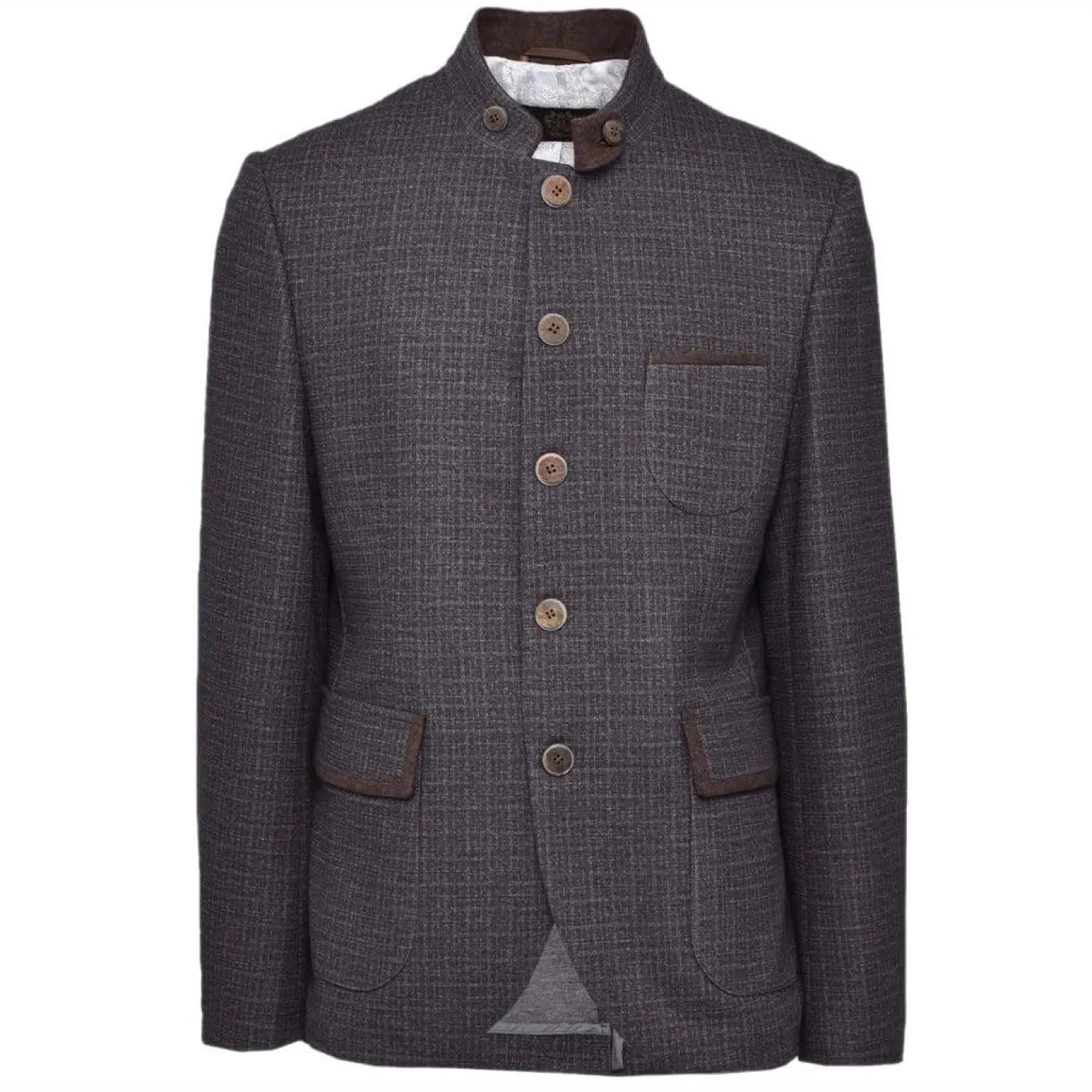 Dieses zeitlose Stück verkörpert den perfekten Mix aus Stil und Komfort, ideal für festliche Anlässe oder einen lässigen Look.Das weiche Material dieses Sakko bietet einen unvergleichlichen Tragekomfort, der Sie den ganzen Tag begleitet. Das edle Muster verleiht dem Sakko eine ansprechende Note, die sich perfekt mit den Metallknöpfen harmonisiert. Die Liebe zum Detail zeigt sich auch in den zwei Eingriffstaschen und der Brusttasche, die nicht nur funktional sind, sondern auch das Gesamtbild der Jacke abrunden.Der Stehkragen verleiht dem Sakko eine zusätzliche Raffinesse und unterstreicht den traditionellen Charme.