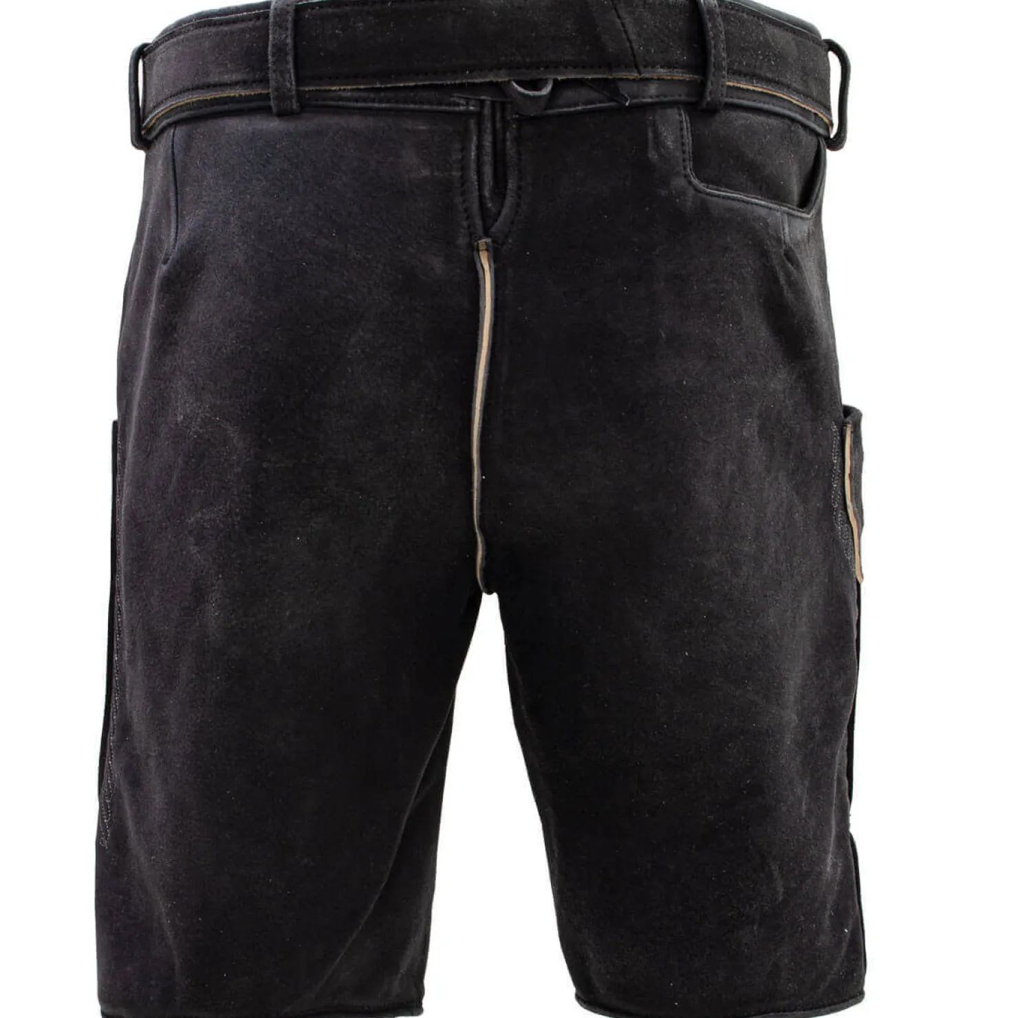 Die Herren-Lederhose in einem dunkleren Grau verfügt über eine verstellbare Schnürung am hinteren Bund sowie einen Gürtel, der mit einer Schnalle im österreichischen Adler-Stil verziert ist. Sie ist ausgestattet mit Hosentaschen, einer seitlichen Messertasche, Hirschhornknöpfen und schönen Stickereien.