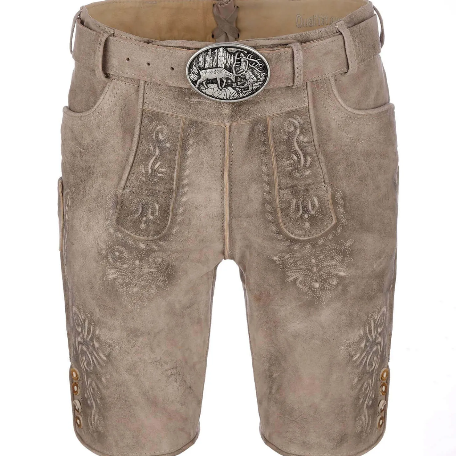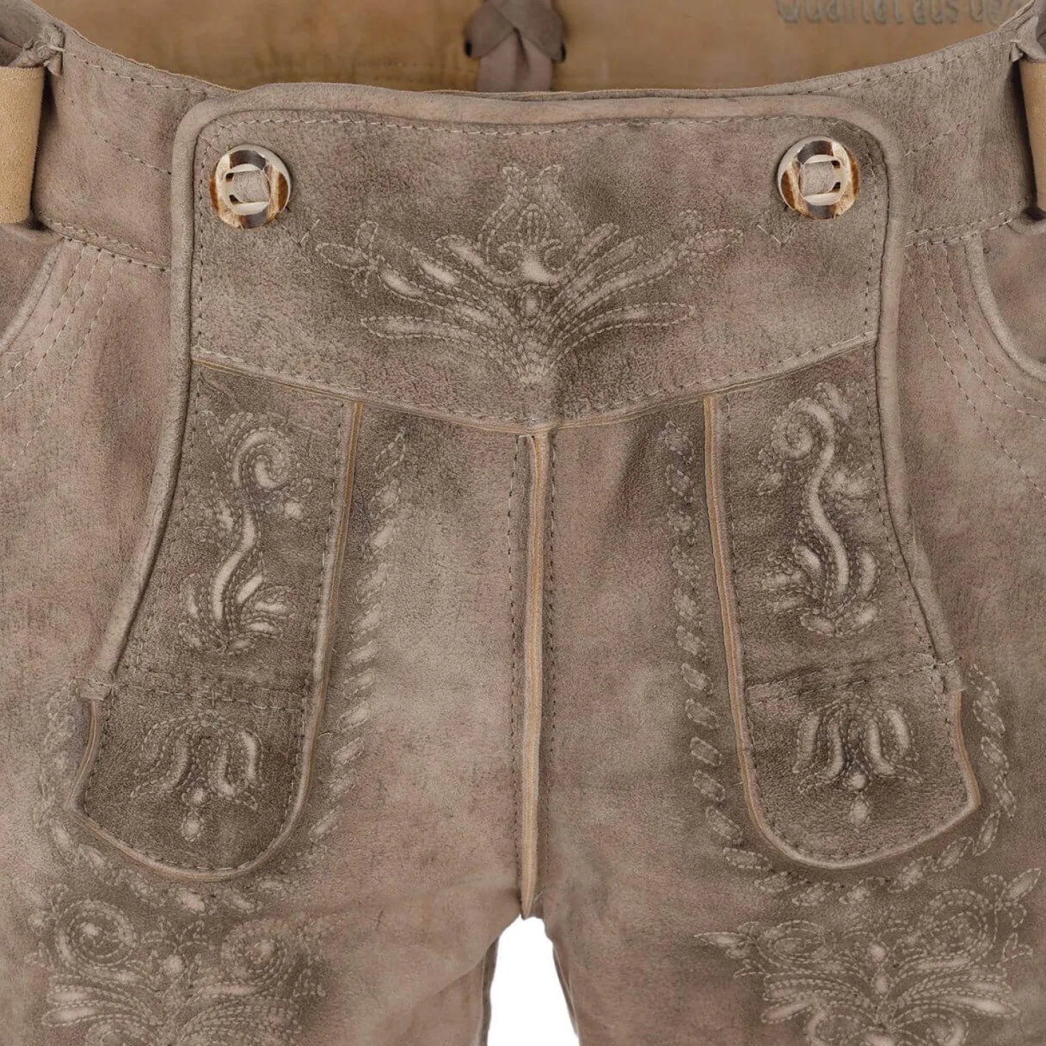 Aus geschmeidigem Ziegenleder in Grau garantiert die Herren-Lederhose höchsten Tragekomfort. Sie ist mit einem verstellbaren Bund, praktischen Taschen, kunstvollen Stickereien, Hirschhornknöpfen und einer bronzefarbenen Gürtelschnalle mit Hirschmotiv ausgestattet.