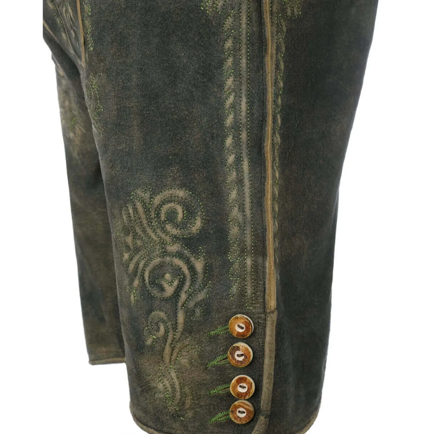 Ein weiteres Highlight der Lederhose ist die bronzefarbene Gürtelschnalle, die einen markanten Akzent setzt. Die Schnalle ist zusätzlich mit einem verzierten Hirschkopf versehen. Der Beinabschluss wird mit schönen Hirschhornknöpfen geschmückt. Hinten in der Mitte sind Bänder angebracht, mit denen die Weite der Hose individuell angepasst werden kann. Der Latz wird mit eleganten Hirschhornknöpfen geschlossen.
