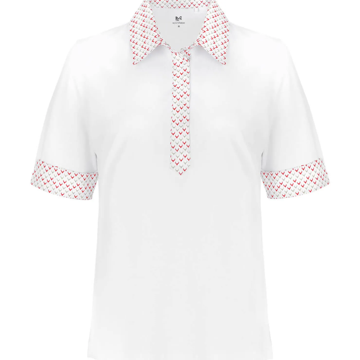Der Kragen, die Kragenleiste und die Ärmelenden sind mit einem farblich abgestimmten Hirschmuster verziert, was dem Shirt eine besondere Note verleiht und es zu einem echten Hingucker macht. Genießen Sie den stilvollen Komfort und die außergewöhnliche Qualität des Poloshirts „Marina“.