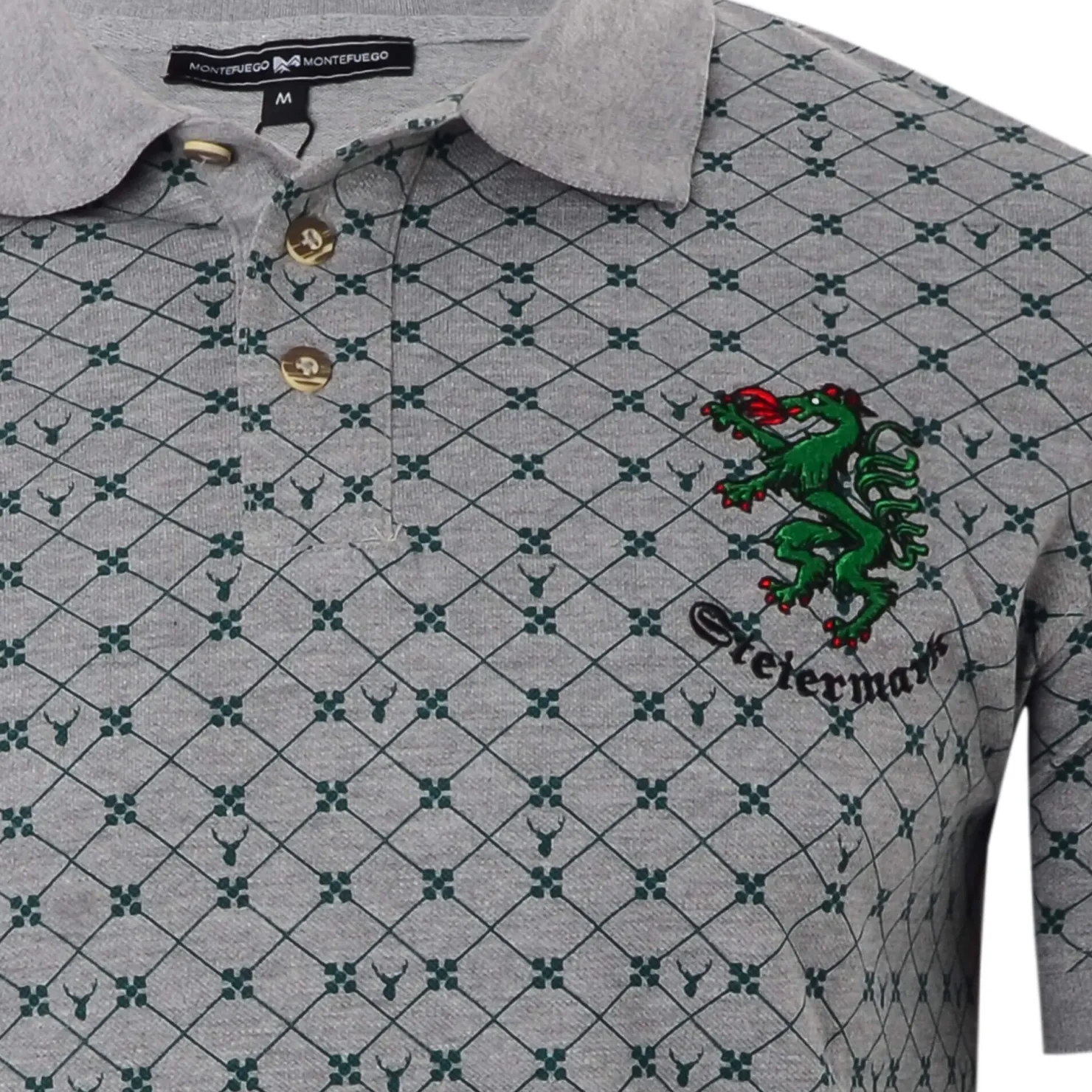 Dieses graue Herren-Poloshirt sieht toll aus mit seinem besonderen Allover-Druck und der Steiermark-Panther-Stickerei auf der Vorderseite. Die drei traditionellen Knöpfe am Kragen geben dem Poloshirt einen besonderen Look. Das Poloshirt hat eine normale Passform, sitzt sehr bequem und ist angenehm auf der Haut. Es ist perfekt für Freizeit und besondere Anlässe.Dieses Poloshirt kombiniert Tradition und modernen Stil und ist ideal für Männer, die gute Qualität und schöne traditionelle Details mögen.