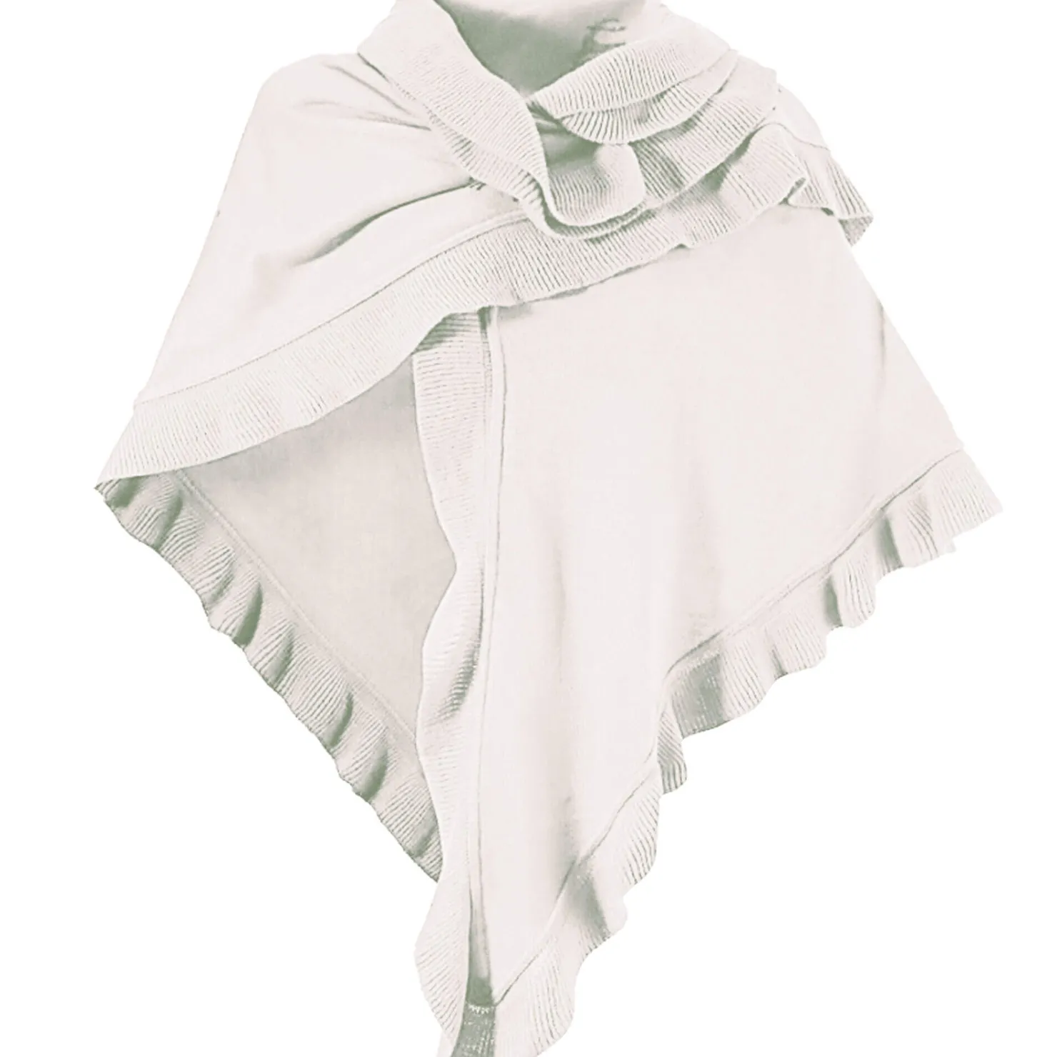 Ein Damen-Strickponcho in sanfter Naturfarbe mit verspielten Rüschen, der zeitlose Eleganz und behaglichen Tragekomfort verbindet.