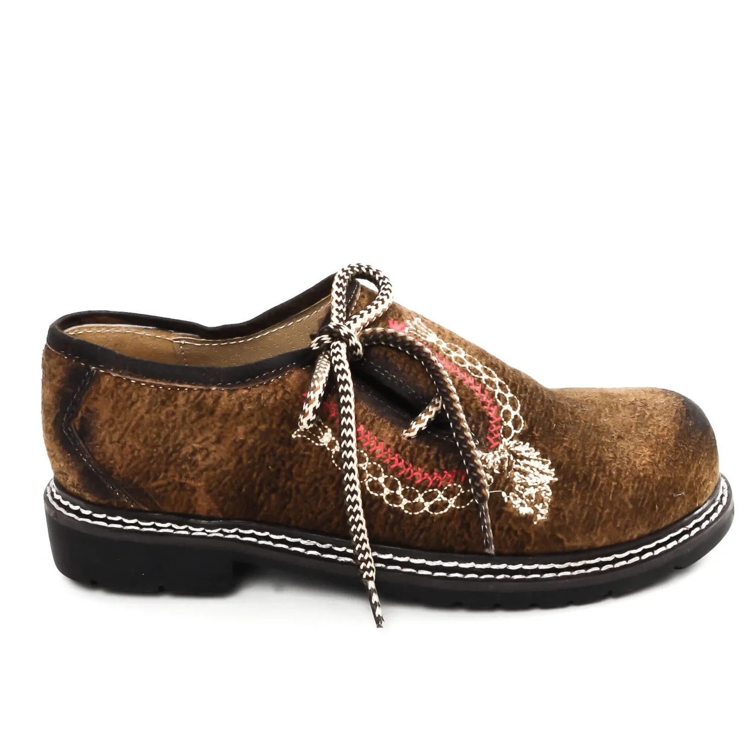 Die Kinder Haferlschuhe „Austria“ sind aus weichem Ziegenleder gemacht. Sie haben eine runde Spitze, einen bequemen Absatz und lassen sich leicht an- und ausziehen dank der einseitigen Schnürung. Die Schuhe sind braun mit einer hübschen weißen und roten Verzierung. Die braunen Bänder und die schwarze Sohle runden das klassische Design ab. Perfekt für Alltag und besondere Anlässe.