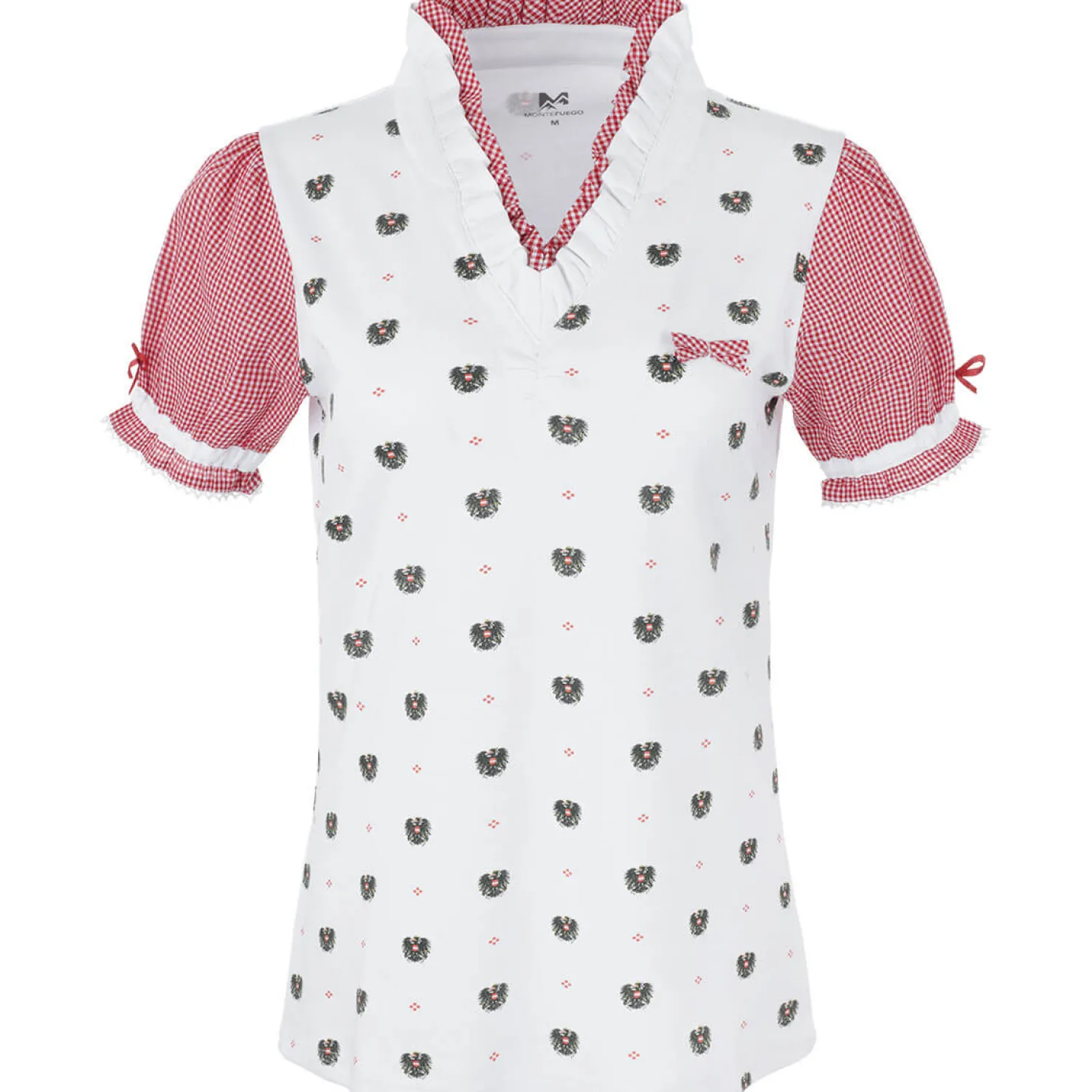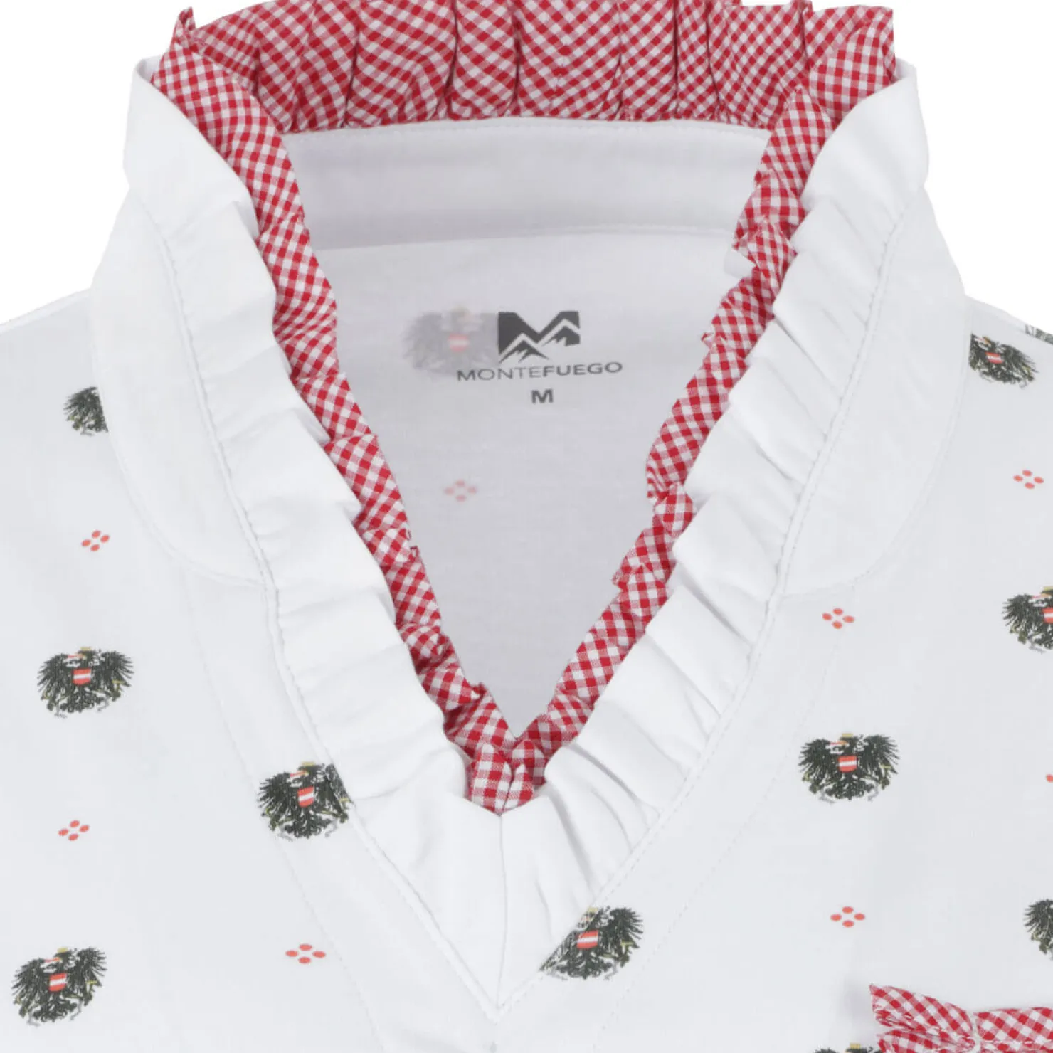 Hergestellt aus 100 % Baumwolle, ist das Damen Rüschen-Shirt in Weiß mit roten Akzenten. Es bietet einen V-Ausschnitt mit Rüschen, Puffärmelchen im Karomuster und eine karierte Masche auf der Brust. Das Highlight sind die vielen kleinen Österreich-Adler, die als Verzierung dienen.