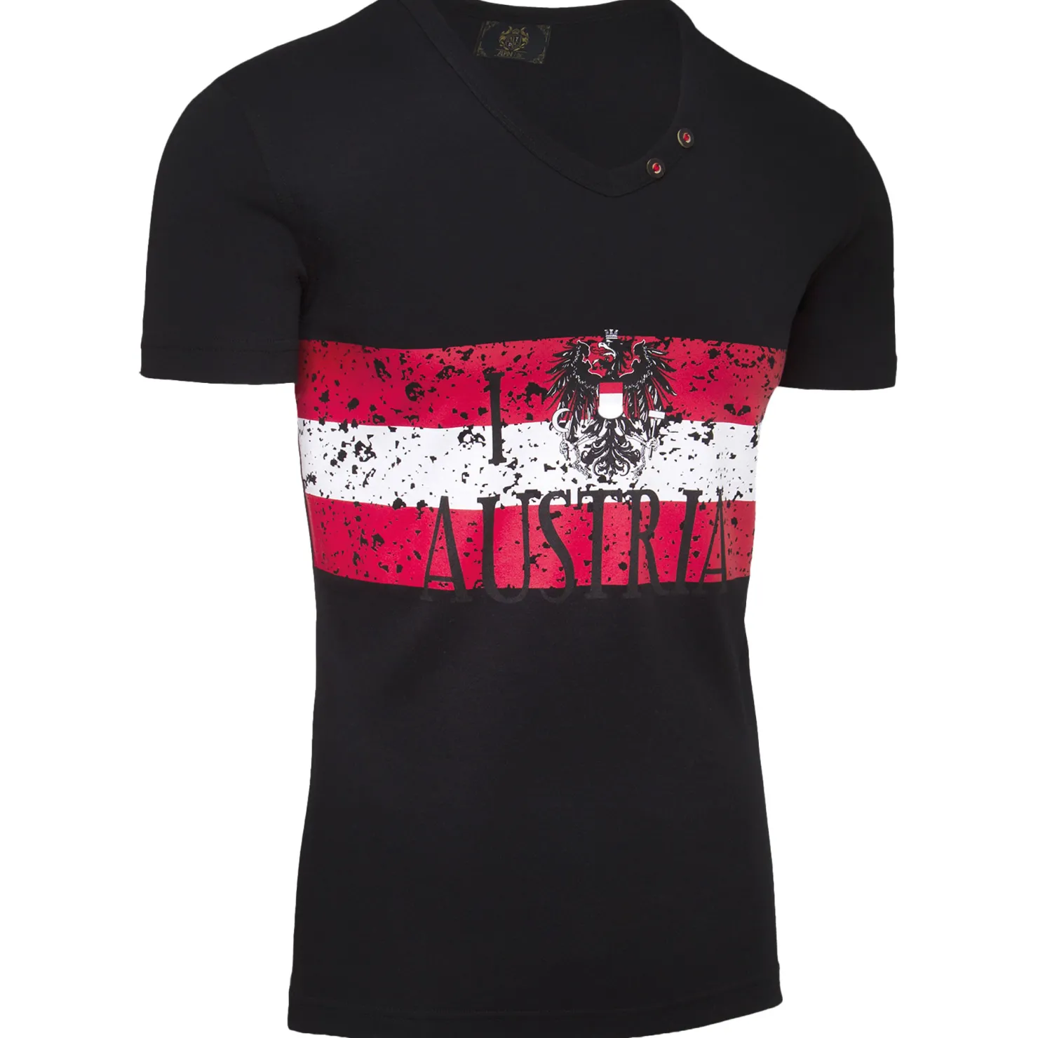 Herren T-Shirt in Schwarz mit auffälligem Rot-Weiß-Rot Print und dem markanten Schriftzug „Austria“ auf der Vorderseite. Das Shirt mit modischem V-Ausschnitt, der mit zwei dekorativen Knöpfen verziert ist, bietet eine stilvolle Kombination aus sportlichem Design und patriotischem Flair.