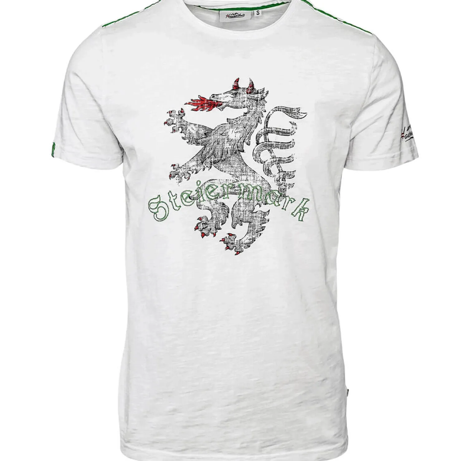 Weißes Herren T-Shirt „Steiermark“ aus Baumwolle. Kurzarm, angenehm zu tragen und verziert mit dem Steiermark Panther und dem gesticktem „Steiermark“ Schriftzug. Logo-Details an Ärmelenden und seitlich unten.